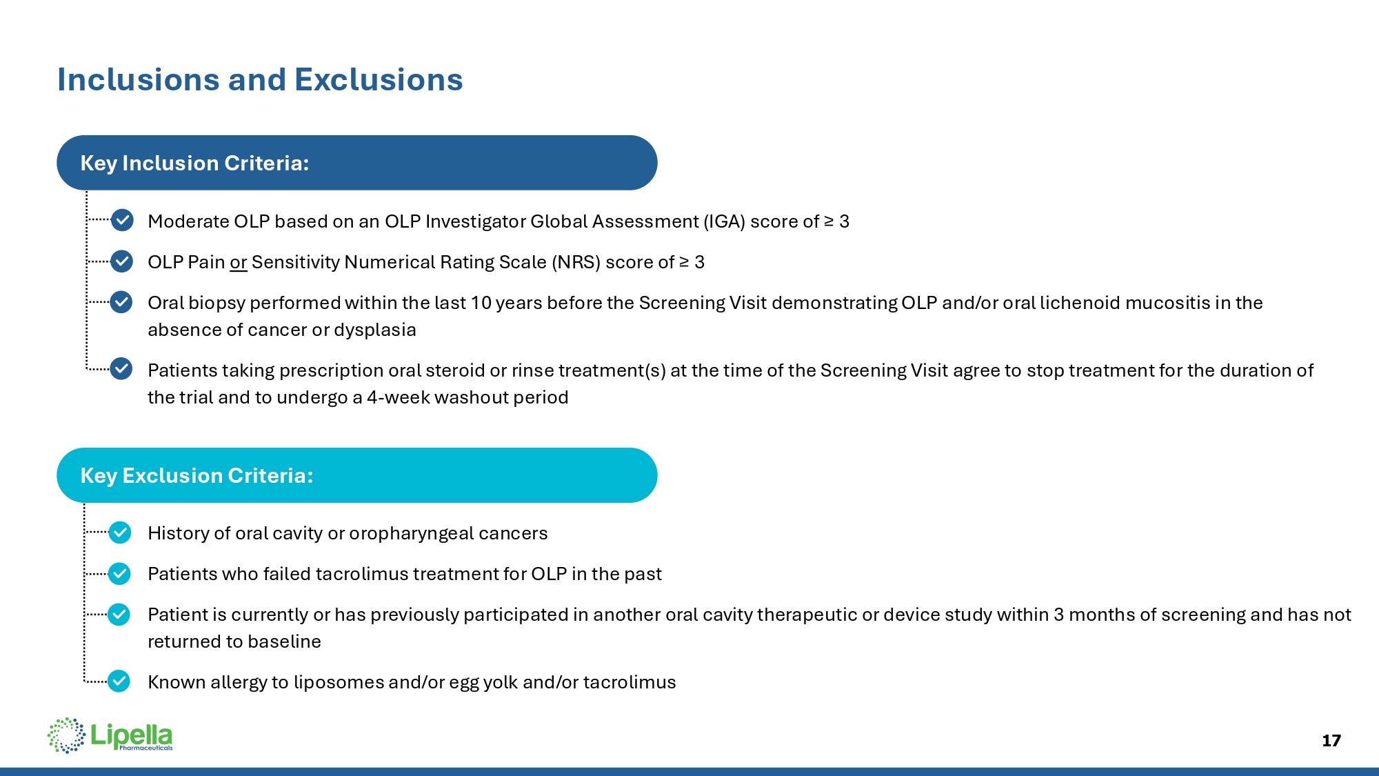 17中度的OLP基于OLPTERM3和/或口腔苔藓样黏膜炎且不存在癌症或发育不良的筛选访视时服用处方口服类固醇或冲洗治疗的患者在筛选访视时同意在整个试验期间停止治疗的≥ 3项筛查访视前最近10年内进行的TERM3或TERM3的口腔活检的OLP研究者全球评估(IGA)评分≥ 3项口腔疼痛或敏感度数值评定量表(NRS)评分并接受4周的口腔或口咽癌病史洗涤期既往因OLP而接受他克莫司治疗失败的患者患者目前或以前在scr een ing后3个月内参加过另一项口腔治疗或器械研究,且尚未恢复到基线已知的对脂质体和/或蛋黄和/或他克莫司的过敏内含物和排除物关键纳入标准:关键排除标准: