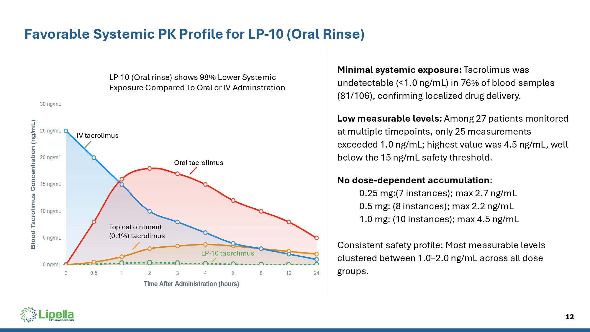 12最小全身暴露:76%的血液样本(81/106)检不出他克莫司(< 1.0ng/mL),证实局部给药。可测量水平低:在多个时间点监测的27名患者中,仅有25名测量值超过1.0ng/ml;最高值为4.5ng/ml,远低于15ng/ml的安全阈值。无剂量依赖性积累:0.25毫克:(7例);最大2.7纳克/毫升0.5毫克:(8例);最大2.2纳克/毫升1.0毫克:(10例);最大4.5纳克/毫升一致安全性概况:所有剂量组的大多数可测量水平聚集在1.0– 2.0纳克/毫升之间。LP-10(口服冲洗)显示与口服或静脉给药相比全身暴露低98%他克莫司口服他克莫司外用软膏(0.1%)他克莫司LP-10他克莫司对LP-10(口服冲洗)有利的全身PK谱