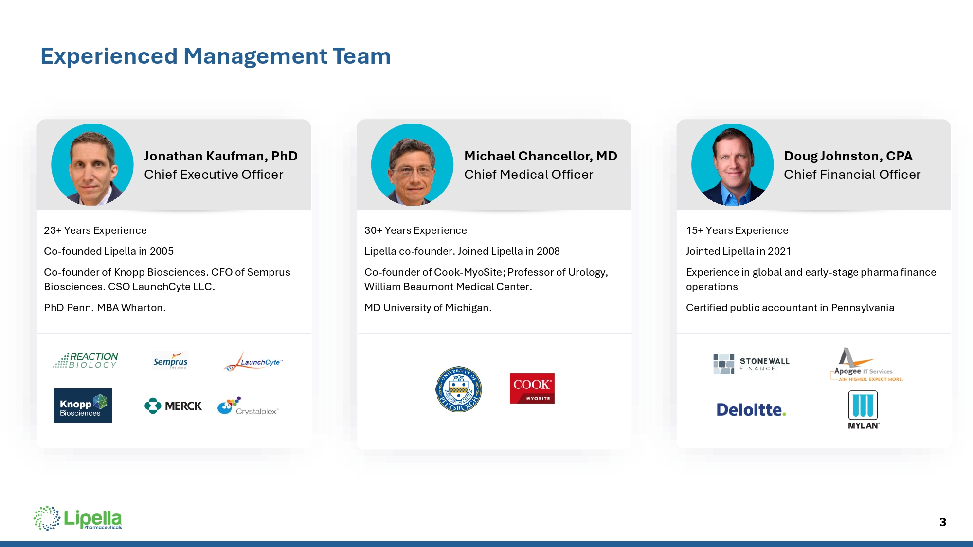 2免责声明提供本演示文稿中的信息是为了让您在本次信息交流会期间熟悉Lipella Pharmaceuticals Inc.(“Lipella”、“公司”、“我们”、“我们”或“我们的”)。我们要求您对我们在本次会议上提供的任何信息进行保密,未经公司事先明确书面许可,您不得向任何其他方披露任何信息。尽管本公司相信本报告所载资料在所有重大方面均属准确,但本公司并不就本报告所载资料的准确性、完整性或可靠性作出任何明示或暗示的陈述或保证。前瞻性陈述该演示文稿包括某些“前瞻性陈述。“除历史事实陈述外,本演示文稿中包含的关于(其中包括)我们的战略、未来运营、财务状况、预期股息、预计成本、前景、管道和机会、增长来源、成功实施我们的专有技术、计划和目标的所有陈述均为前瞻性陈述。前瞻性陈述可以通过“可能”、“将”、“可能”、“继续”、“将”、“应该”、“潜在”、“目标”、“目标”、“预期”、“打算”、“计划”、“寻求”、“相信”、“估计”、“预测”、“预期”、“项目”等词语以及对未来时期的类似提及来识别。前瞻性陈述是基于我们目前对未来事件和财务趋势的预期和假设,我们认为这些事件和财务趋势可能会影响我们的财务状况、经营业绩、业务战略、短期和长期业务运营和目标以及财务需求。由于前瞻性陈述与未来相关,它们受到难以预测的内在不确定性、风险和环境变化的影响。我们的实际结果可能与前瞻性陈述所设想的结果存在重大差异。因此,我们告诫您,不要依赖这些前瞻性陈述中的任何一项。它们既不是历史事实的陈述,也不是对未来业绩的保证或保证。存在已知和未知的风险、不确定性和其他因素,可能导致实际结果与前瞻性陈述中的结果存在重大差异,其中包括但不限于区域、国家或全球政治、经济、商业、竞争、市场和监管条件以及其他因素。我们作出的任何前瞻性陈述均基于我们管理层在作出此类陈述时的合理判断,并且仅在作出该陈述之日发表。可能导致我们实际结果不同的因素或事件可能会不时出现,我们不可能预测所有这些因素或事件。我们不承担更新任何前瞻性陈述的义务,无论是由于新信息、未来发展或其他原因,除非适用法律可能要求。本文所包含的任何内容都不是,也不应被视为,关于过去或未来的承诺或陈述。公司明确表示不承担与使用本演示文稿有关或因使用本演示文稿而导致的任何和所有责任。此外,本演示文稿中包含的信息截至本协议发布之日,公司没有义务更新此类信息,包括在此类信息变得不准确的情况下。您不应将本演示文稿的内容或我们在本次会议上提供的其他信息解释为法律、税务、会计或投资建议或建议。关于本文所述事项的法律和相关事项,您应咨询您自己的法律顾问以及税务和财务顾问。