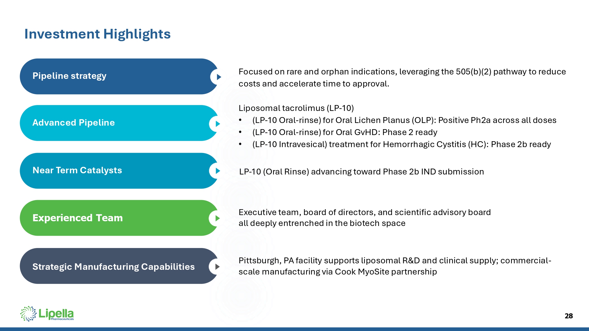 28个经验丰富的团队战略制造能力投资亮点聚焦于罕见和孤儿适应症,利用505(b)(2)路径降低成本并加快获批时间。脂质体他克莫司(LP-10)•(LP-10 ORal-Rinse)用于口服扁平苔藓(OLP):所有剂量的Ph2a阳性•(LP-10 ORal-Rinse)用于口服GVHD:出血性膀胱炎(HC)的2期准备就绪•(LP-10膀胱内)治疗:2b期准备就绪执行团队、董事会和科学顾问委员会都深深扎根于生物技术领域匹兹堡,PA设施支持脂质体研发和临床供应;通过Cook MyoSite合作伙伴关系进行商业规模制造LP-10(Oral Rinse)向2b期IND提交推进Pipeline战略Advanced Pipeline Near Term Catalysts