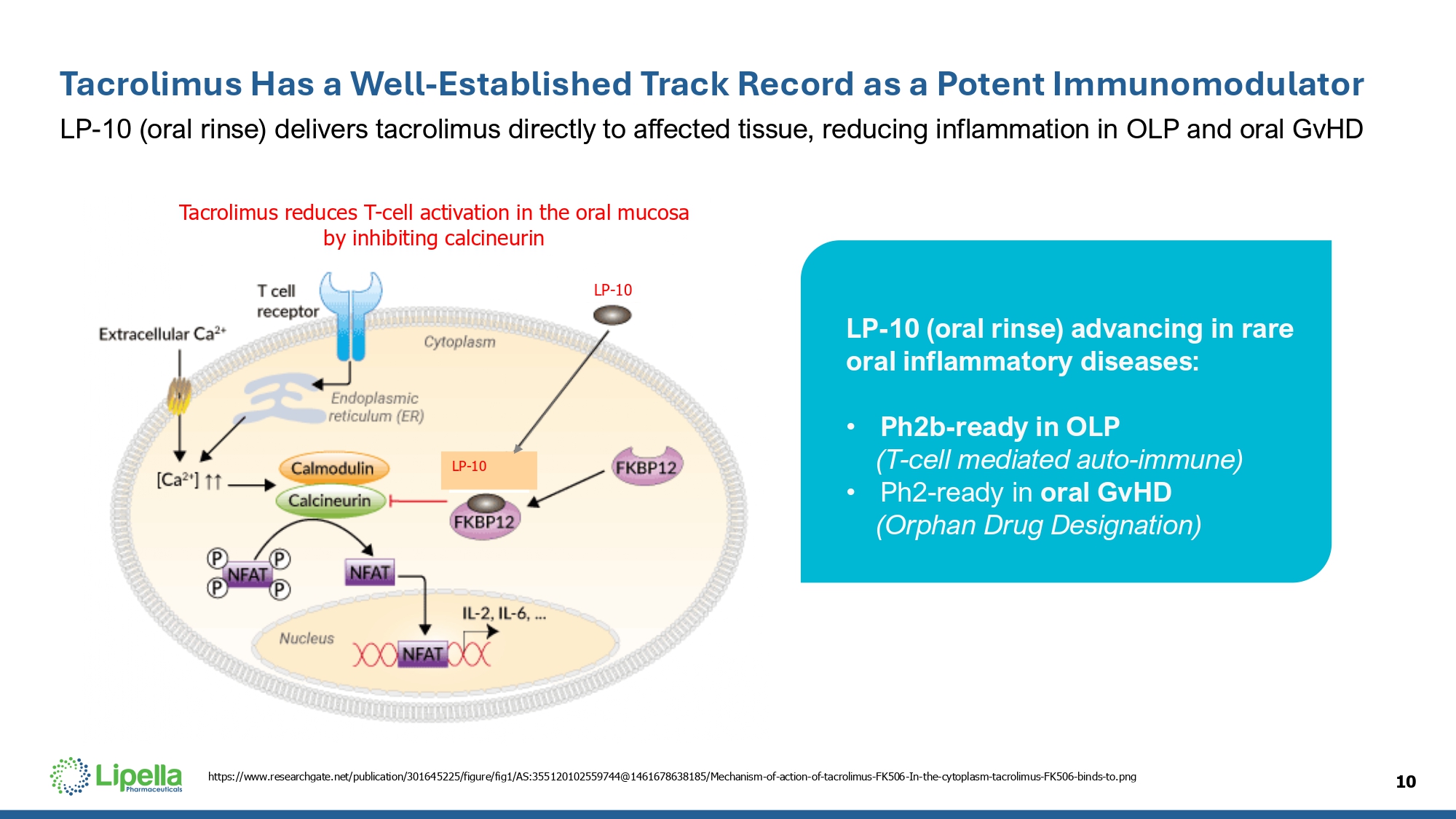 10他克莫司通过抑制钙调磷酸酶LP-10 LP-10他克莫司作为强效免疫调节剂具有良好的往绩记录https://www.researchgate/publication/301645225/figure/fig1/AS:355120102559744 @1461678638185/Mechanism-of-action-of-tacrolimus-FK506-in-the-cytoplasm-tac rolimus-FK506-binds-to.png LP-10(oral rinse)将他克莫司直接递送至受影响的组织,在罕见性口腔炎症性疾病中减轻OLP和口服GVHD LP-10(口服冲洗)中的炎症:• PH2B-ready in OLP(T细胞介导的自身免疫)• Ph2-ready in口服GVHD(孤儿药定点)