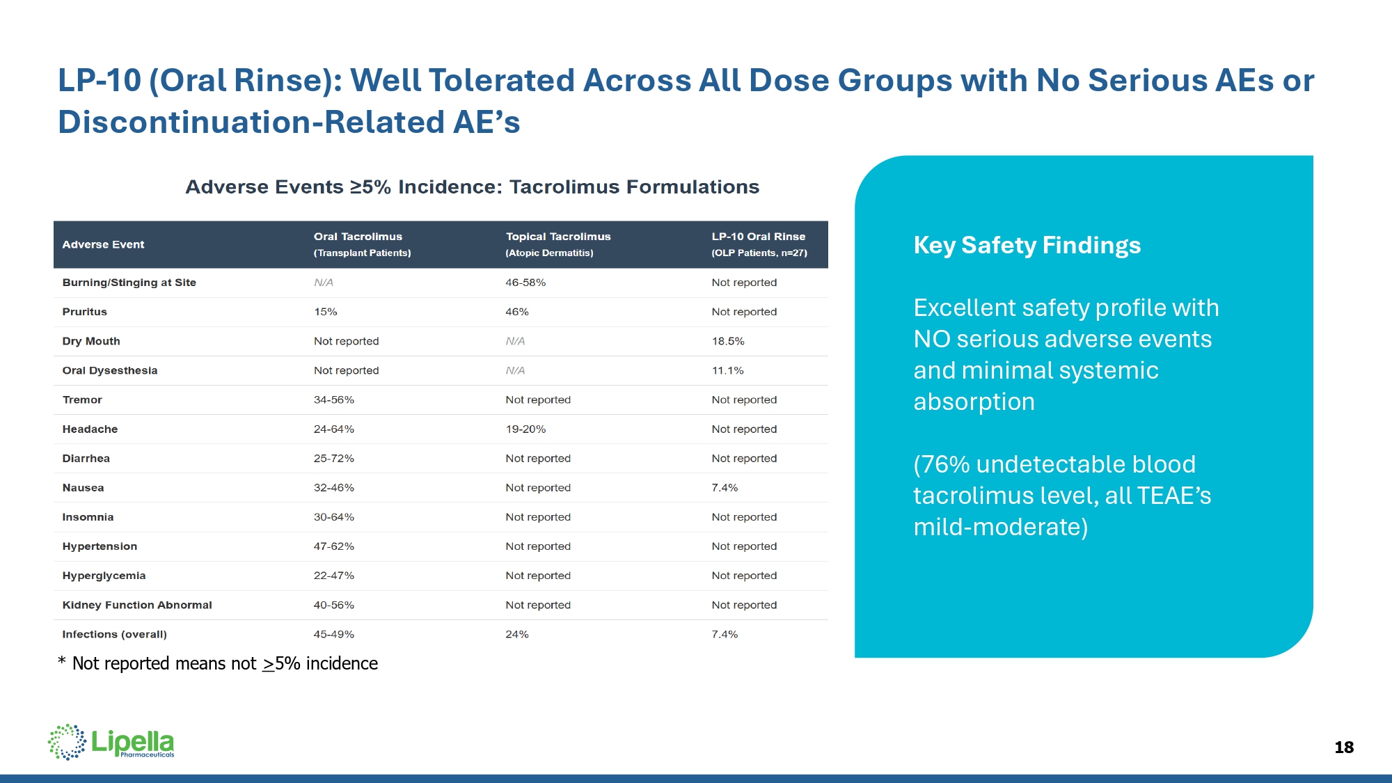 18*未报告意味着没有> 5%的发生率LP-10(口服冲洗):在所有剂量组中具有良好的耐受性,没有严重的AEs或停药-相关AEs的关键安全性发现具有出色的安全性,没有严重的不良事件和最小的全身吸收(76%无法检测到的血液他克莫司水平,所有TEAEs的轻度-中度)