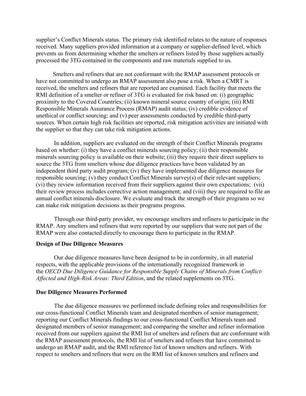 供应商冲突Minerals状态。确定的主要风险与收到的回应的性质有关。许多供应商提供了公司或供应商定义级别的信息,这使我们无法确定这些供应商列出的冶炼厂或精炼厂是否实际加工了供应给我们的组件和原材料中所含的3TG。不符合RMAP评估协议或未承诺接受RMAP评估的冶炼厂和精炼厂也构成风险。当收到CMRT时,将对报告的冶炼厂和精炼厂进行检查。符合3TG的冶炼厂或精炼厂的RMI定义的每个设施的风险评估依据是:(i)与所涵盖国家的地理邻近程度;(ii)已知的矿物来源原产国;(iii)RMI负责任的Minerals保证程序(RMAP)审计状态;(iv)不道德或冲突来源的可靠证据;以及(v)由可靠的第三方来源进行的同行评估。当报告某些高风险设施时,与供应商一起发起风险缓解活动,以便他们能够采取风险缓解行动。此外,供应商根据其冲突Minerals计划的实力进行评估,其依据是否:(i)他们有冲突矿物采购政策;(ii)其负责任的矿物采购政策可在其网站上查阅;(iii)他们要求其直接供应商从其尽职调查做法已得到独立第三方审计计划验证的冶炼厂采购3TG;(iv)他们已实施尽职调查措施负责任的采购;(v)他们对相关供应商进行冲突Minerals调查;(vi)他们根据自己的期望审查从供应商那里收到的信息;(vii)他们的审查过程包括纠正行动管理;(viii)他们被要求提交年度冲突矿物披露。我们评估并跟踪他们项目的实力,这样我们就可以随着他们项目的进展做出风险缓解决策。通过我们的第三方供应商,我们鼓励冶炼厂和精炼商参与RMAP。我们还直接联系了我们供应商报告的任何不属于RMAP的冶炼厂和精炼商,以鼓励他们参与RMAP。尽职调查措施的设计我们的尽职调查措施在所有重大方面均符合《经合组织关于来自受冲突影响和高风险地区的Minerals负责任供应链的尽职调查指南:第三版》以及关于3TG的相关补充文件中国际公认框架的适用条款。已采取尽职调查措施我们采取的尽职调查措施包括为我们的跨职能冲突Minerals团队和指定的高级管理人员定义角色和责任;向我们的跨职能冲突Minerals团队和指定的高级管理人员报告我们的冲突Minerals调查结果;并将从我们的供应商处收到的冶炼厂和精炼商信息与符合RMAP评估协议的RMI冶炼厂和精炼商名单、承诺接受RMAP审计的RMI冶炼厂和精炼商名单以及已知冶炼厂和精炼商的RMI参考名单进行比较。关于上榜RMI名单的已知冶炼厂和精炼商的冶炼厂和精炼商以及