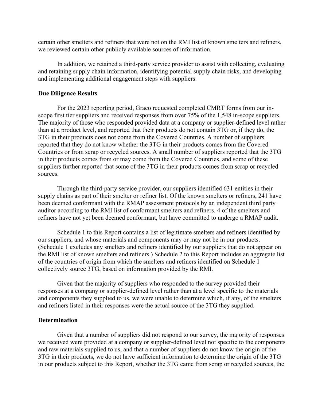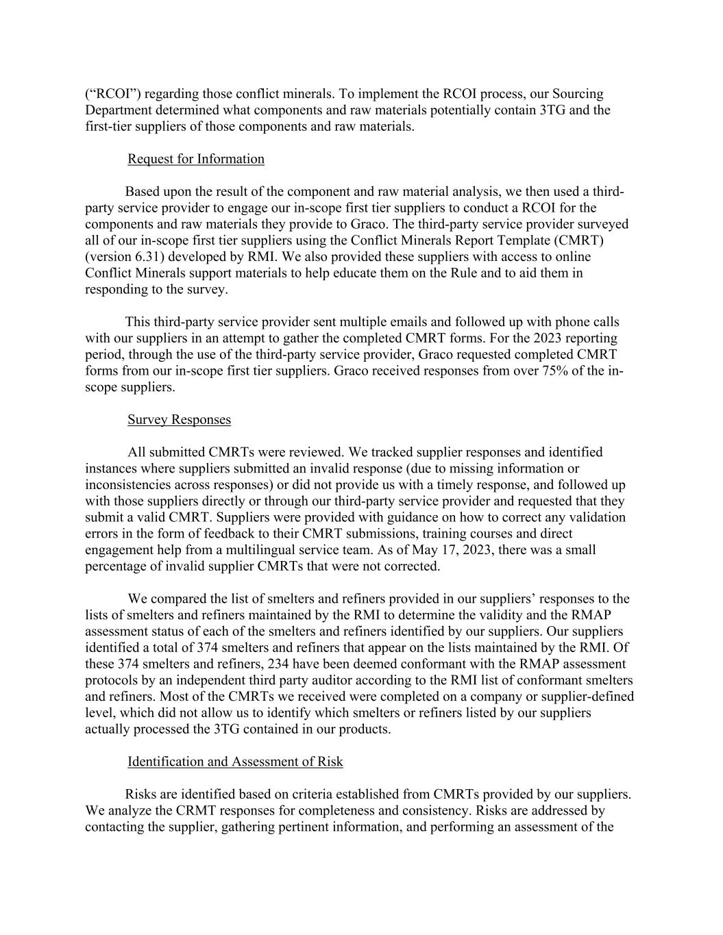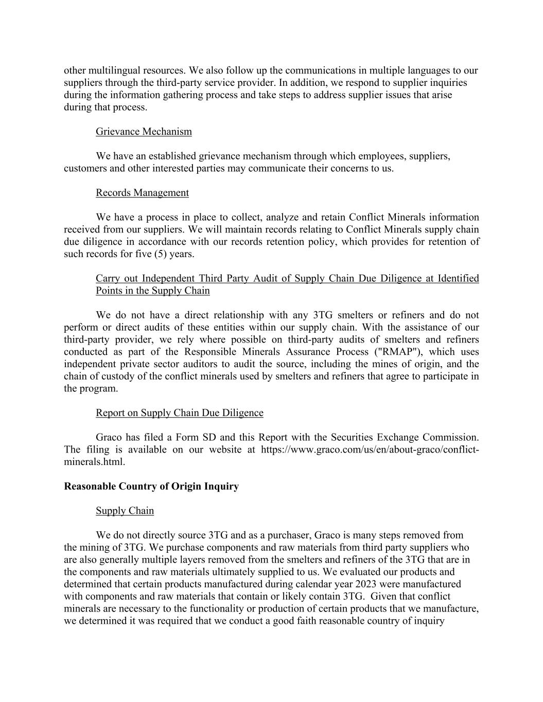 其他多语言资源。我们还通过第三方服务商跟进以多种语言与供应商的沟通。此外,我们在信息收集过程中回应供应商的询问,并采取措施解决该过程中出现的供应商问题。申诉机制我们有一个既定的申诉机制,员工、供应商、客户和其他利益方可以通过该机制向我们传达他们的关切。记录管理我们有一个适当的流程来收集、分析和保留从供应商那里收到的冲突Minerals信息。我们将根据我们的记录保留政策维护与冲突Minerals供应链尽职调查相关的记录,该政策规定将此类记录保留五(5)年。在供应链中确定的点对供应链尽职调查进行独立的第三方审计我们与任何3TG冶炼厂或精炼厂没有直接关系,也不对我们供应链中的这些实体进行或直接进行审计。在我们的第三方供应商的协助下,我们尽可能依赖对冶炼厂和精炼商进行的第三方审计,这是负责任的Minerals保证流程(“RMAP”)的一部分,该流程使用独立的私营部门审计员来审计来源,包括原产地矿山,以及同意参与该计划的冶炼厂和精炼商使用的冲突矿物的保管链。关于供应链尽职调查的报告固瑞克已向美国证券交易委员会提交了表格SD和本报告。该文件可在我们的网站上查阅:https://www.graco.com/us/en/about-graco/conflict-minerals.html。合理的原产国询价供应链我们不直接采购3TG并且作为采购商,固瑞克是从3TG的开采中移除的多个步骤。我们从第三方供应商采购组件和原材料,这些供应商通常也是从3TG的冶炼厂和精炼厂中移除的多层,这些组件和原材料最终供应给我们。我们评估了我们的产品,并确定在2023日历年制造的某些产品是使用含有或可能含有3TG的组件和原材料制造的。鉴于冲突矿物对我们制造的某些产品的功能或生产是必要的,我们确定要求我们进行一个善意合理的调查国家