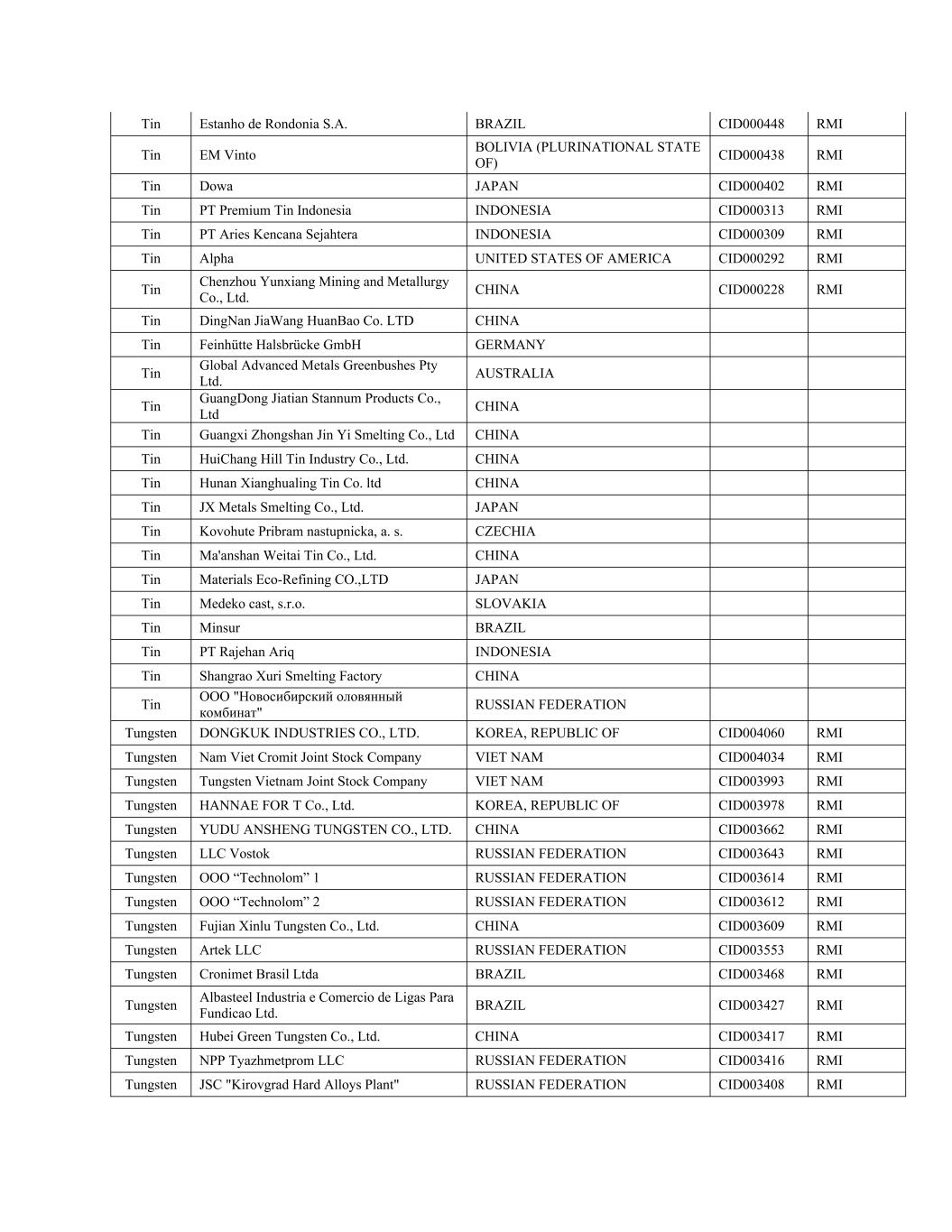 Tin Estanho de Rondonia S.A. Brazil CID000448 RMI Tin EM Vinto BOLIVIA(多民族国)CID000438 RMI Tin Dowa Japan CID000402 RMI Tin PT Premium Tin Indonesia Indonesia CID000313 RMI Tin PT Aries Kencana Sejahtera Indonesia CID000309 RMI Tin Alpha United States of America CID000292 RMI Tin郴州云翔矿冶有限公司中国CID000228 RMI Tin Dingnan Jiawang HuanBao Co.,Ltd中国锡铁Ltd中国锡汇昌山锡业有限公司中国锡湖南湘华岭锡业有限公司中国锡JX金属冶炼有限公司日本锡Kovohute Pribram nastupnicka,a. s.捷克锡马鞍山伟泰锡业有限公司中国锡材料生态精炼有限公司日本锡Medeko Cast,s.r.o.斯洛伐克锡Minsur巴西锡PT Rajehan Ariq Indonesia锡上饶旭日冶炼厂中国锡OUAA "丨丨丨丨丨丨丨丨丨丨丨丨丨丨丨丨丨丨丨丨丨丨丨丨丨丨丨丨丨丨丨丨丨丨丨丨丨丨丨丨丨丨丨丨丨丨丨丨丨丨丨丨丨丨丨丨丨丨丨丨丨丨丨丨丨丨丨丨丨丨丨丨丨丨丨丨丨丨丨丨丨丨丨丨丨丨丨丨丨丨丨韩国CID004060共和国RMI Tungsten Nam Viet Cromit股份公司越南CID004034 RMI Tungsten Tungsten越南股份公司VIET NAM CID003993 RMI Tungsten HANNAE for T Co.,Ltd.韩国CID003978大韩民国RMI Tungsten YUDU ANSHENG Tungsten Co.,Ltd。中国CID003662 RMI钨业LLC Vostok俄罗斯联邦CID003643 RMI钨业OOO“Technolom”1俄罗斯联邦CID003614 RMIRMI钨OOO“Technolom”2俄罗斯联邦CID003612 TERM3钨福建新鹭钨业有限公司中国CID003609 RMI钨业Artek LLC俄罗斯联邦CID003553 RMI Tungsten Cronimet Brasil Ltda Brazil CID003468 RMI Tungsten Albazeel Industria e Comercio de Ligas Parcio