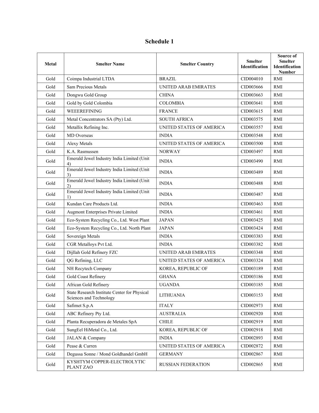 Gold Bangalore Refinery India CID002863 RMI Gold ModelTech Sdn Bhd Malaysia CID002857 RMI Gold Sai Refinery India CID002853 RMITERM2 Gold GGC Gujrat Gold Centre PV.Ltd. India CID002852 RMI Gold AU Traders and Refiners South Africa CID002850 RMI Gold Ogussa Osterreichische Gold-und Silber-Scheideanstalt GmbH Austria CID002779 RMI Gold WIELAND EDelmetalle GmbH Germany CID002778 TERMRMIRMI Gold Italpreziosi ITALY CID002765 TERM0 RMI葡萄牙CID002760 RMI黄金深圳市翠鹭黄金有限公司中国CID002750 RMI Gold Abington Reldan Metals,LLC美国CID002708 RMI Gold TOO Tau-Ken-Altyn哈萨克斯坦CID002615 RMI Gold Marsam Metals巴西CID002606 RMI Gold韩国锌业有限公司韩国,CID002605共和国RMI Gold Shirpur Gold Refinery Ltd.印度CID002588 RMI Gold Industrial Refining Company BELGIUM CID002587 RMI Gold Fujairah Gold FZC UNITED Arab Emirates CID002584 RMI丨Gold REMONDIS PMR B.V. NETHERLANDS CID002582 RMI丨Gold T.C.A S.p.A ITALY CID002580 RMI丨Gold Sudan Gold Refinery Sudan CID002567 丨TERM6丨Gold Kaloti Precious Metals UNITED Arab EMIRATES CID002563 丨RMI丨Gold International Precious Metal Refiners UNRLtd.中国CID002527 RMI黄金山东沪蒙冶炼有限公司中国CID002525 RMI Gold Singway科技有限公司台湾、中国CID002516省RMI Gold Fidelity Printers and Refiners Ltd. ZIMBABWE CID002515 RMI Gold KGHM Polska Miedz Spolka Akcyjna POLAND CID002511 RMI Gold MMTC-PAMP India Pvt.,Ltd.印度CID002509 RMI Gold Umicore Precious Metals Thailand CID002314 RMI Gold Guangdong Jinding Gold Limited China CID11LtdCHINA CID002243 RMI黄金中金黄金公司中原黄金冶炼厂CHINA CID002224 RMI