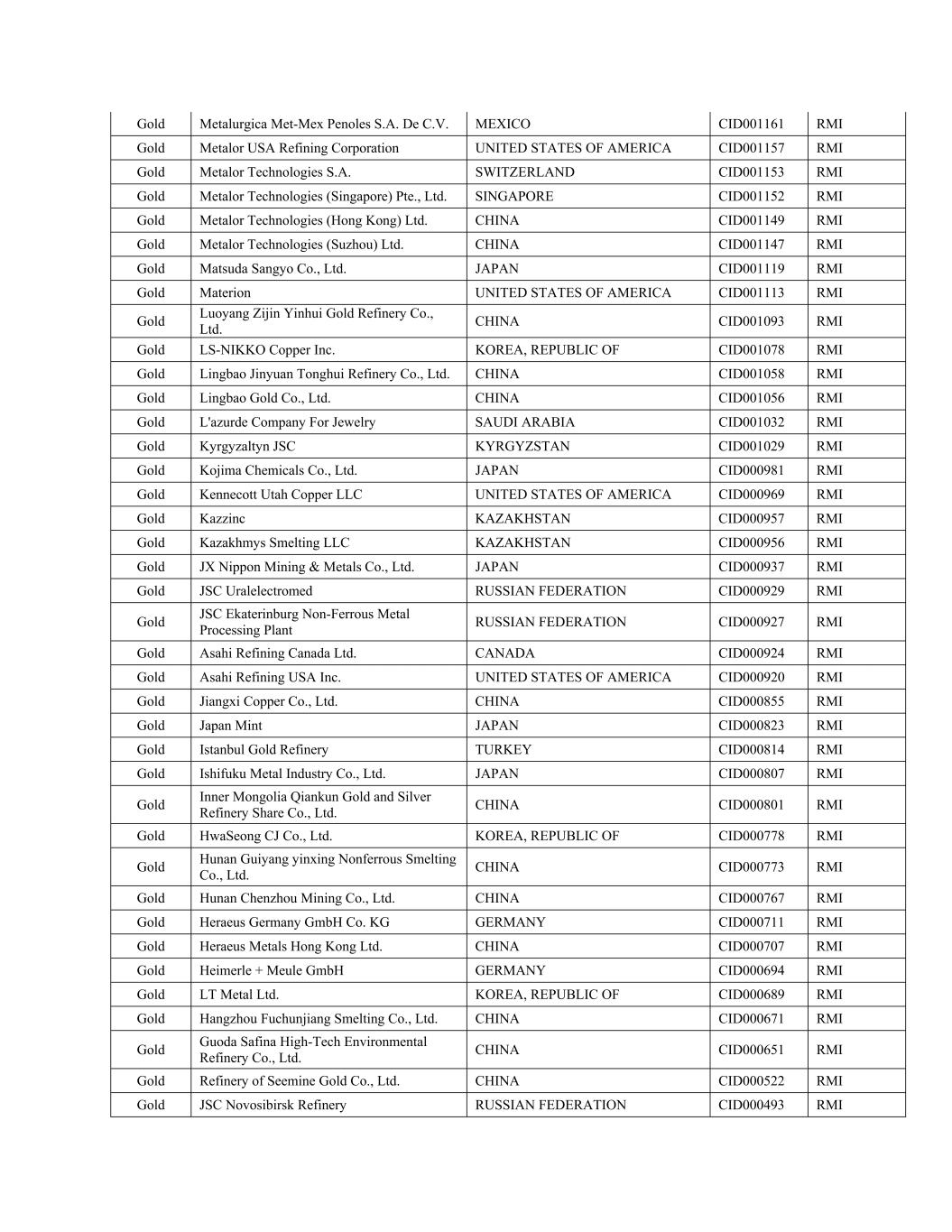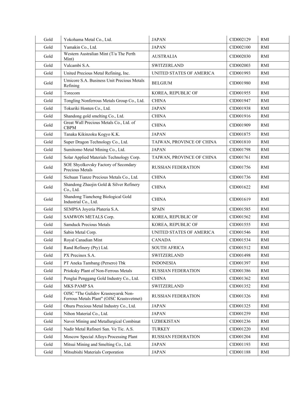 Gold Yokohama Metal Co.,Ltd. JAPAN CID002129 RMI Gold Yamakin Co.,Ltd. JAPAN CID002100 RMI Gold Western Australia Mint(T/a The Perth Mint)AUSTRALIA CID002030 RMITERMGold Valcambi S.A. SWITZERLAND CID002003 RMITERM3 Gold United Precious Metal Refining,Inc. United States of AMERICA CID001993 TERM0RMI Gold Umicore S.A.业务部贵金属精炼比利时CID001980 RMI Gold Torecom Korea,REPUBLIC of CID001955 RMI Gold铜陵有色金属集团有限公司。株式会社CBPM中国CID001909 RMI黄金Tanaka Kikinzoku Kogyo K.K.日本CID001875 RMI Gold Super Dragon Technology Co.,Ltd. Taiwan,Province of China CID001810 RMI Gold Sumitomo Metal Mining Co.,Ltd. JAPAN CID001798 RMITERM3 Gold Solar 应用材料 Technology Corp. Taiwan,Province of China CID001761 RMITERM5 gold SOE Shyolkovsky factory of secondary precious metals RUSSIA FEDERATION CID001756 RMI gold四川天泽贵金属有限公司China CID0017Ltd.中国CID001619 RMI Gold SEMPSA Joyeria Plateria S.A.西班牙CID001585 RMI Gold Samwon Metals Corp.韩国,CID001562大韩民国RMI Gold Samduck Precious Metals韩国,CID001555大韩民国RMITERM3 Gold Sabin Metal Corp.美国CID001546 RMI Gold加拿大皇家铸币厂CID001534 RMI Gold Rand Refinery(Pty)Ltd.南非CID001512 RMI丨金PX Precinox S.A.瑞士中国CID001362 RMI黄金MKS PAMP SA瑞士CID001352 RMI黄金OJSC“The Gulidov Krasnoyarsk有色金属厂”(OJSC Krastsvetmet)俄罗斯联邦CID001326 RMI Gold Ohura贵金属工业有限公司日本CID001325 RMI Gold Nihon Material Co.,Ltd.日本CID001259 RMI Gold Navoi Mining and Metallurgical Combinat Uzbekistan CID001236 RMI Gold Nadir Metal Rafineri San。Ve Tic。A.S.土耳其CID001220 RMI Gold莫斯科特种合金加工厂俄罗斯联邦CID001204 RMI Gold三井矿业冶炼有限公司日本CID001193 RMI Gold Mitsubishi Materials Corporation JAPAN CID001188 RMI