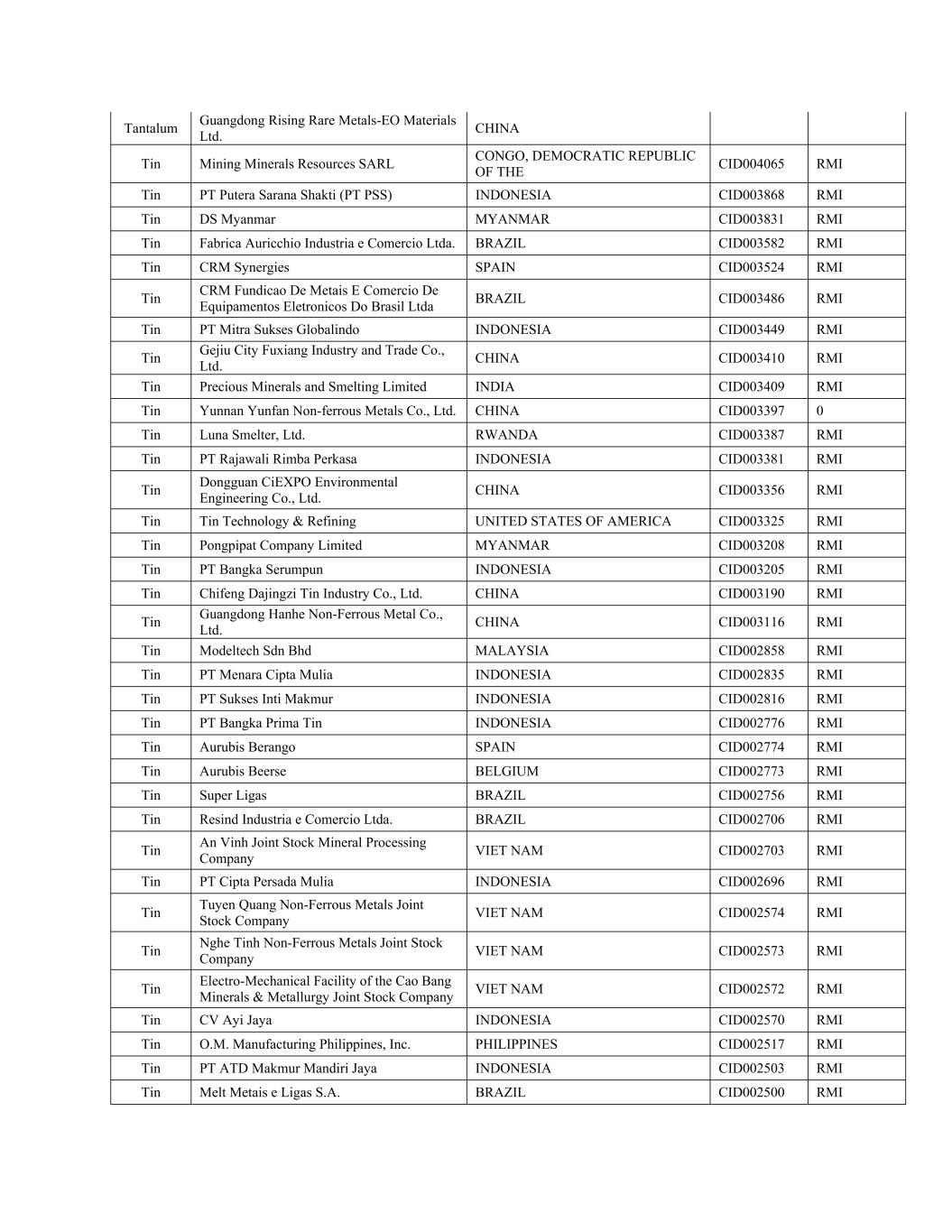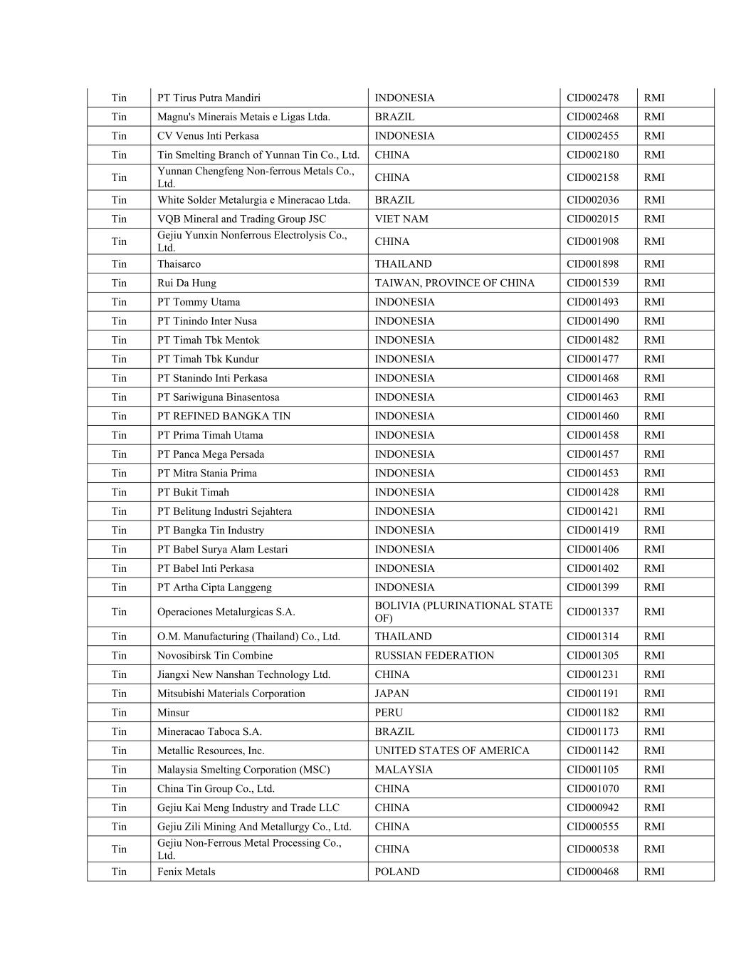 钽业广东瑞星稀有金属-EO Materials Ltd. China Tin Mining Minerals Resources SARL CONGO,Democratic Republic of the CID004065 RMI Tin PT Putera Sarana Shakti(PT PSS)Indonesia CID003868 RMI Tin DS Myanmar Myanmar CID003831 RMI Tin Fabrica Auricchio Industria e Comercio Ltda。巴西CID003582 RMI Tin CRM Synergies西班牙CID003524 RMI Tin CRM Fundicao de Metais e Comercio de Equipamentos Eletronicos do Brasil Ltda Brazil CID003486 RMI Tin PT Mitra Sukses Globalindo Indonesia CID003449 RMI Tin Gejiu City Fuxiang Industry and Trade Co.,Ltd. China CID003410 RMI Tin Precious Minerals and Smelting Limited India CID003409 RMI Tin云南云帆有色金属有限公司China CID003397 0 Tin Luna Smel7Ltd. China CID003356 RMI Tin Tin Technology & Refining United States of America CID003325 RMI Tin Pongpipat Company Limited MYANMAR CID003208 RMI Tin PT Bangka Serumpun Indonesia CID003205 RMI Tin赤峰大井子锡业有限公司China CID003190 RMI Tin广东汉和有色金属有限公司,Ltd. China CID003116 RMI Tin ModelTech Sdn Bhd Malaysia CID002858 RMI Tin PT Menara Cipta Mulia Indonesia CID002835 RMI Tin PT Sukses Inti Makmur Indonesia CID002816 RMI Tin PT Bangka Prima Tin Indonesia CID002776 RMI Tin Aurubis Berango SPAIN CID002774 RMI Tin Aurubis Beerse BELGIUM CID002773 RMI Tin Super Ligas Brazil CID002756 RMI Tin Resind Industria e Commercio Ltda。巴西CID002706 RMI Tin An Vinh股份公司矿产加工公司VIET NAM CID002703 RMI Tin PT Cipta Persada Mulia INDONESIA CID002696 RMI Tin Tuyen Quang有色金属股份公司VIET NAM CID002574 TERM3 Tin Nghe Tinh有色金属股份公司VIET NAM CID002573 RMI Tin Electro-Mechanical Facility of the Cao Bang Minerals & Metallurgy Joint Stock Company VIET NAM CID002572 RMI Tin CV Ayi Jaya INDONESIA CID002570 RMI Tin O.M. Manufacturing Philippines,Inc。