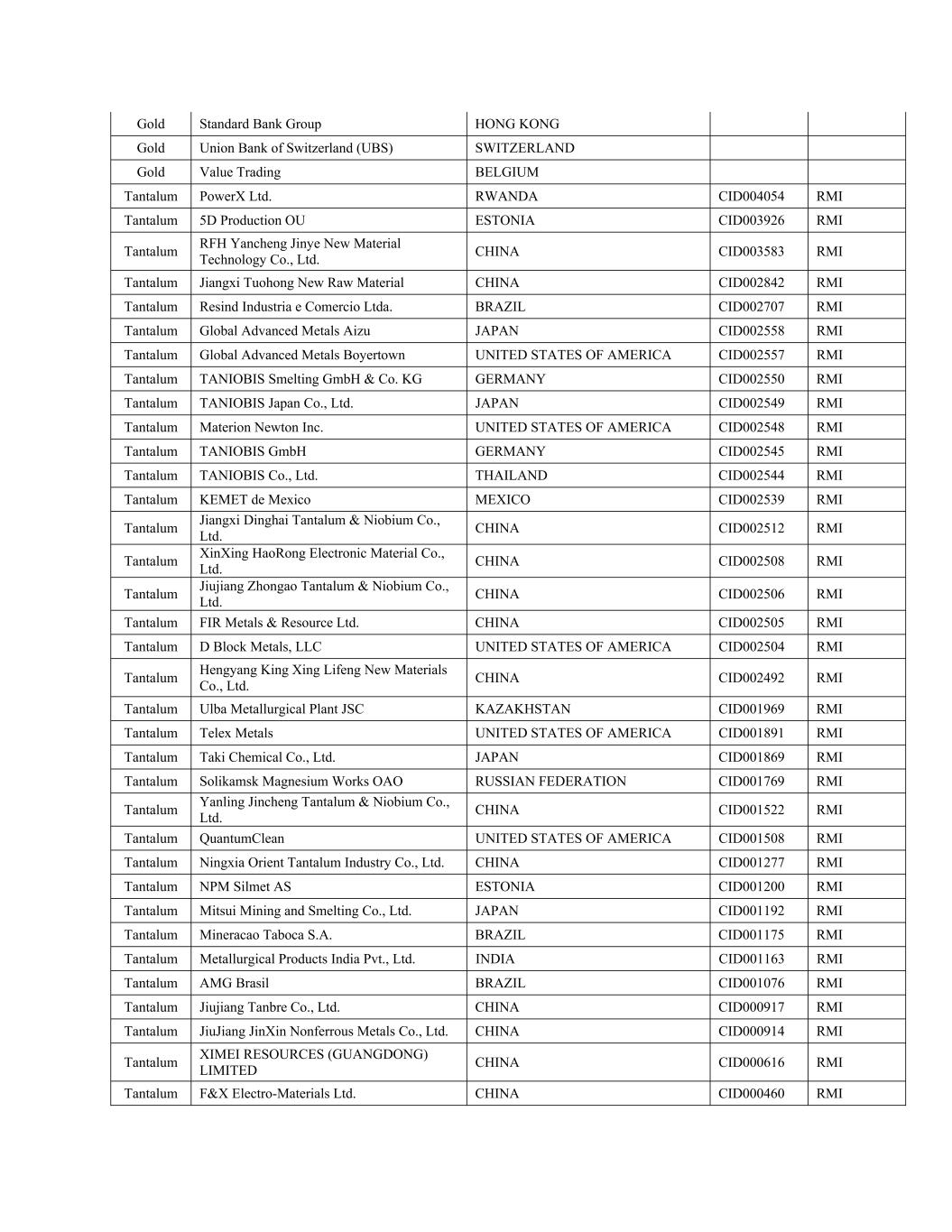 Gold Standard银行集团香港黄金联合瑞士银行(UBS)瑞士黄金价值交易比利时钽电X有限公司RWANDA CID004054 RMI丨钽5D生产OU ESTONIA CID003926 RMI钽业RFH盐城金业新材料科技有限公司中国CID003583 RMI丨钽江西拓宏新原料中国CID002842 TERM4TERM4丨钽树脂工业电子商务有限公司。巴西CID002707 RMI钽业全球先进金属会津日本CID002558 RMI钽业全球先进金属Boyertown美国CID002557 RMI钽业TANIOBIS Smelting GmbH & Co. KG德国CID002550 TERM3钽业TANIOBIS Japan Co.,Ltd. Japan CID002549丨RMI RMI丨钽材料丨Materion丨Newton Inc.美国CID002548丨RMI RMI丨钽业TANIOBIS GmbH德国CID002545 RMI钽业中国CID002506 RMI钽业FIR Metals & Resource Ltd.中国CID002505 RMI钽业D Block Metals,LLC美国CID002504 RMI钽业衡阳王兴利丰新材料有限公司中国CID002492 RMITERM4钽业Ulba冶金厂JSC哈萨克斯坦CID001969 RMITERM5钽业Telex Metals美国CID001891 RMITERM6钽业Taki化学有限公司日本CID001869 RMI钽业SolikamLtd.中国CID001277 RMI钽矿NPM Silmet as爱沙尼亚CID001200 RMI钽业三井矿业冶炼有限公司日本CID001192 RMITERM2 Tantalum Mineracao Taboca S.A.巴西CID001175 RMITERM3 Tantal Metallurgical Products India Pvt.,Ltd.印度CID001163 RMI Tantalum TERM0巴西CID001076 RMI Tantalum Jiujiang Tanbre Co.,Ltd.中国CID000917 RMI Tantalum Jiujiang Jinxin有色金属有限公司中国