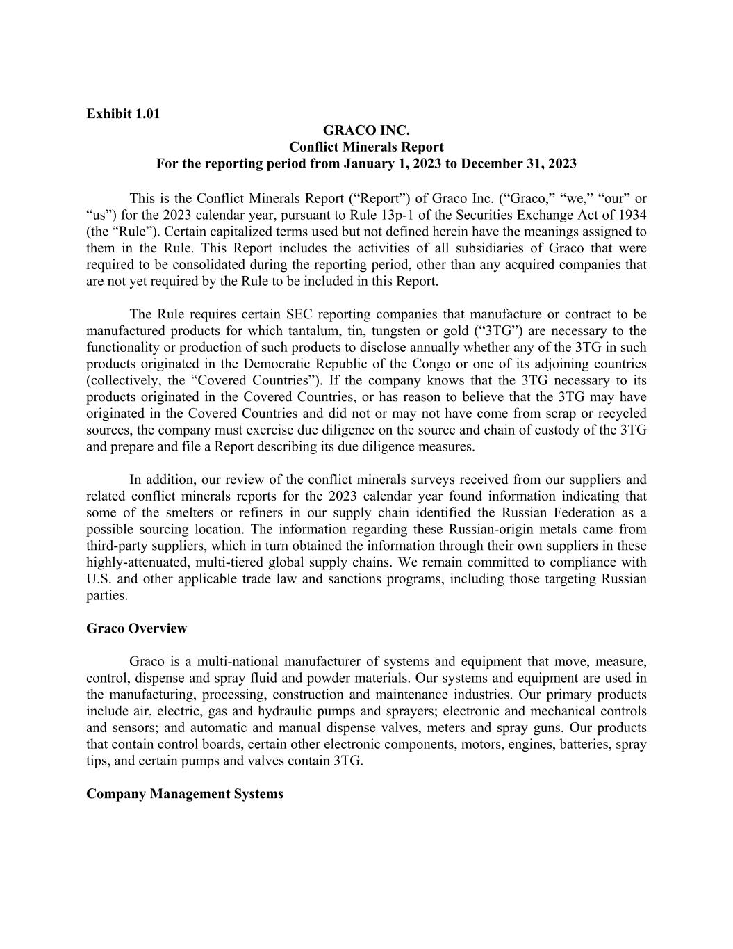 附件 1.01 GRACO公司2023年1月1日至2023年12月31日报告期间冲突Minerals报告这是Graco Inc.TERM2固瑞克(“TERM3”、“我们”、“我们的”或“我们”)根据1934年证券交易法第13p-1条规则(“规则”)为2023日历年编制的冲突Minerals报告(“报告”)。此处使用但未定义的某些大写术语具有规则中赋予它们的含义。本报告包括固瑞克所有被要求在报告期间合并的子公司的活动,但规则尚未要求纳入本报告的任何被收购公司除外。该规则要求某些SEC报告公司,凡制造或承包为此类产品的功能或生产所必需的钽、锡、钨或金(“3TG”)的制成品,每年披露此类产品中的任何3TG是否起源于刚果民主共和国或其毗邻国家之一(统称为“涵盖国家”)。如果公司知道其产品所需的3TG起源于所涵盖的国家,或有理由相信3TG可能起源于所涵盖的国家,并且没有或可能没有来自废料或回收来源,公司必须对3TG的来源和保管链进行尽职调查,并编制和提交一份报告,说明其尽职调查措施。此外,我们对从我们的供应商收到的冲突矿物调查和2023日历年相关冲突矿物报告的审查发现,有信息表明,我们供应链中的一些冶炼厂或精炼商将俄罗斯联邦确定为可能的采购地点。有关这些俄罗斯原产金属的信息来自第三方供应商,而第三方供应商又通过他们自己在这些高度衰减、多层次的全球供应链中的供应商获得了这些信息。我们仍然致力于遵守美国和其他适用的贸易法和制裁计划,包括针对俄罗斯各方的制裁计划。固瑞克综述固瑞克是一家跨国制造商,生产移动、测量、控制、分配和喷洒流体和粉体材料的系统和设备。我们的系统和设备应用于制造、加工、建筑和维修行业。我们的主要产品包括空气、电动、气体和液压泵和喷雾器;电子和机械控制和传感器;以及自动和手动分配阀、仪表和喷枪。我们的产品含有控制板、某些其他电子元器件、电机、发动机、电池、喷头、某些泵阀含有3TG。公司管理系统