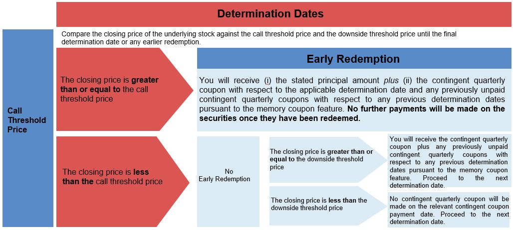 如果最终确定日以外的任何确定日标的股票的收盘价大于或等于赎回阀值价格,则该证券将自动赎回,赎回金额等于紧接相关确定日之后的第一个或有息票支付日的提前赎回款项。一旦赎回证券,将不会再支付任何款项。 |