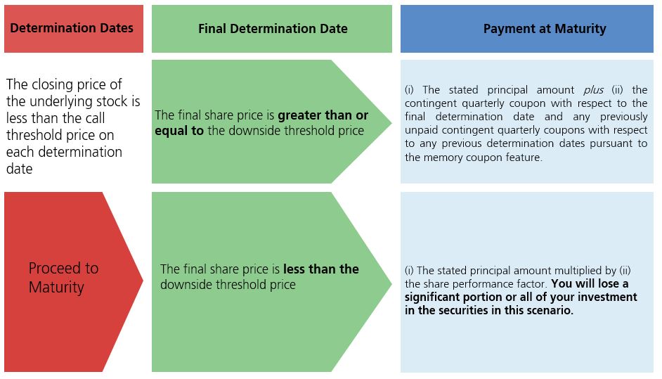 因相关确定日标的股票收盘价低于下跌门槛价而未在或有付息兑付日(到期日除外)支付或有季度息票的,如果该较后或有付息兑付日对应的确定日标的股票收盘价大于或等于下跌门槛价,则在较后的或有付息兑付日支付该或有季度息票。为免生疑问,一旦先前未支付的或有季度息票在较后的或有息票支付日支付完毕,将不会在随后的任何或有息票支付日再次支付。 如果标的股票在每个确定日期的收盘价均低于下跌阈值价格,则您在该证券的期限内将不会获得或有季度票息,也不会获得正收益。 |