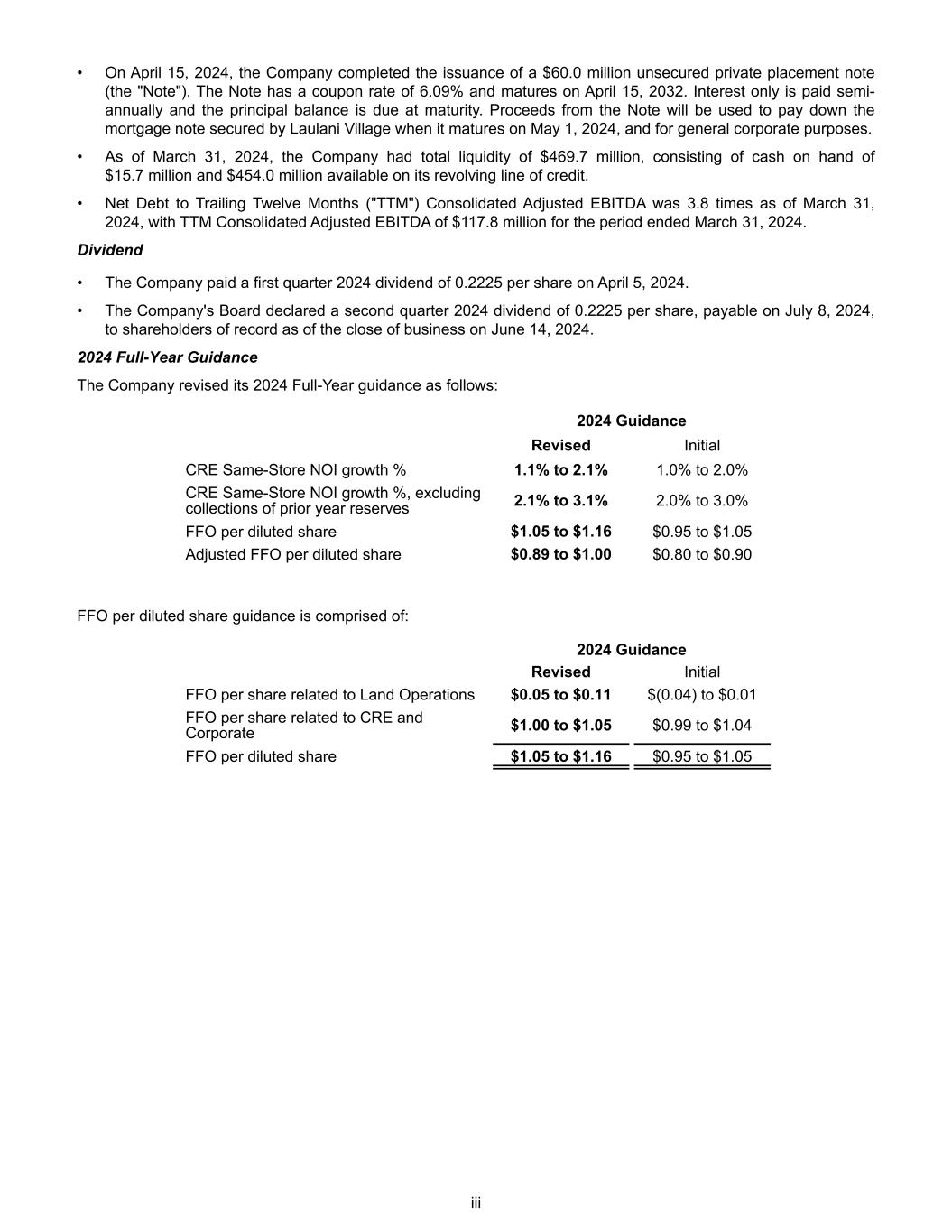 • 2024年4月15日,公司完成了6000万美元无担保私募票据(“票据”)的发行。该票据的票面利率为6.09%,于2032年4月15日到期。每半年只付息一次,本金余额到期。票据所得款项将用于在2024年5月1日到期时偿还由Laurani Village担保的抵押票据,并用于一般公司用途。•截至2024年3月31日,公司流动资金总额为4.697亿美元,其中包括手头现金1570万美元和循环信贷额度可用的4.54亿美元。•截至2024年3月31日,截至过去12个月的净债务(“TTM”)合并调整后EBITDA为3.8倍,截至2024年3月31日止期间,TTM合并调整后EBITDA为1.178亿美元。股息•公司于2024年4月5日支付2024年第一季度股息每股0.2225。•公司董事会宣布2024年第二季度股息为每股0.2225,将于2024年7月8日支付给截至2024年6月14日营业结束时登记在册的股东。2024年全年指引公司修订2024年全年指引如下:经修订的初步CRE同店NOI增长% 1.1%至2.1% 1.0%至2.0% CRE同店NOI增长%,不包括上一年准备金的收取2.1%至3.1% 2.0%至3.0% FFO每股摊薄收益1.05美元至1.16美元0.95美元至1.05美元调整后FFO每股摊薄收益0.89美元至1.00美元0.80美元至0.90美元2024年指导FFO每股摊薄收益指导包括:2024年指导修订后与土地运营相关的每股初始FFO 0.05美元至0.11美元(0.04)至0.01美元与CRE和企业相关的每股FFO 1.00美元至1.05美元0.99美元至1.04美元FFO每股摊薄收益1.05美元至1.16美元0.95美元至1.05美元三