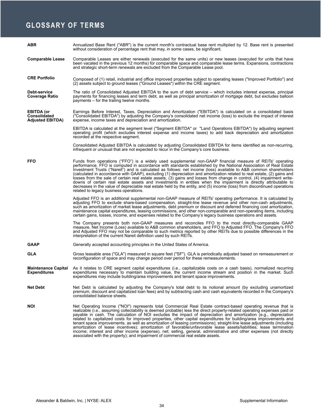 期限汇总表ABR年化基本租金(“ABR”)为当月合同基本租金乘以12。基本租金的列报没有考虑在某些情况下可能很重要的百分比租金。可比租赁可比租赁是续租(针对相同单元执行)或新租赁(针对过去12个月内已腾出的单元执行),用于可比空间和可比租赁条款。可比租赁池中不包括扩张、收缩和战略性短期续租。CRE投资组合由CRE分部内的(1)受经营租赁约束的零售、工业和办公改善物业(“改善投资组合”)和(2)受地面租赁约束的资产(“地面租赁”)组成。偿债覆盖率过去12个月的合并调整后EBITDA与偿债总额的比率——包括利息支出、融资租赁和定期债务的本金支付,以及抵押债务的本金摊销,但不包括气球付款。EBITDA(或合并调整后EBITDA)利息、税项、折旧及摊销前利润(“EBITDA”)是通过调整公司的合并净收益(亏损)以排除利息费用、所得税和折旧及摊销的影响,在合并基础上计算得出的(“合并EBITDA”)。EBITDA是在分部层面(“分部EBITDA”或“土地运营EBITDA”)计算的,方法是调整分部营业利润(不包括利息费用和所得税),以加回在相应分部记录的折旧和摊销。合并调整后EBITDA的计算方法是对公司核心业务中预计不会再次发生的被确定为非经常性、不经常或不寻常项目的合并EBITDA进行调整。FFO运营资金(简称“FFO”)是REITs运营业绩的一种广泛使用的补充性非GAAP财务指标。FFO按照美国全国房地产投资信托协会(“Nareit”)制定的标准计算,计算如下:A & B普通股股东可获得的净收入(亏损)(按照公认会计原则计算),不包括(1)与房地产相关的折旧和摊销,(2)出售某些房地产资产的损益,(3)控制权变更的损益,(4)减值减记-当减值直接归因于实体持有的可折旧房地产价值下降时,某些房地产资产和对实体的投资,(5)与遗留业务运营相关的已终止经营业务的收入(亏损)。调整后的FFO是REITs经营业绩的额外补充非GAAP衡量标准。通过调整FFO计算得出,不包括以股份为基础的薪酬、直线租赁收入和其他非现金调整,例如市场租赁调整的摊销、债务溢价或折价和递延融资成本摊销、维护资本支出、租赁佣金以及其他不可比和非经营性项目,包括与公司遗留业务运营和资产相关的某些收益、损失、收入和费用。该公司提出了非GAAP衡量标准,并将FFO与最直接可比的GAAP衡量标准、A & B普通股股东可获得的净收入(亏损)以及FFO与调整后的FFO进行了核对。公司的FFO和调整后的FFO可能无法与其他REITs报告的此类指标进行比较,原因是此类REITs使用的当前Nareit定义的解释可能存在差异。美国公认会计原则公认会计原则。GLA总可出租面积(“GLA”),单位为平方英尺(“SF”)。GLA是根据空间的重新测量或重新配置而定期调整的,并且对于这些重新测量,可能会随着时间的推移而变化。维持性资本支出,因为它涉及CRE部门的资本支出(即以现金为基础的可资本化成本)、维持建筑价值所必需的正常化经常性支出、当前的收入流和在市场中的地位。此类支出可能包括建筑/面积改善和租户空间改善。净负债净负债的计算方法是将公司的总债务调整至其名义金额(不包括未摊销的溢价、贴现和资本化的贷款费用),并减去公司合并资产负债表中记录的现金和现金等价物。NOI净营业收入(“NOI”)是指可变现(即假设可收回性被认为很可能)的基于商业房地产合同的营业收入总额减去以现金支付或应付的直接与财产相关的运营费用。NOI的计算排除了折旧和摊销的影响(例如,与改善物业的资本化成本相关的折旧, 用于建筑物/面积改善和租户空间改善的其他资本支出,以及租赁佣金的摊销);直线租赁调整(包括租赁奖励的摊销);有利/不利租赁资产/负债的摊销;租赁终止收入;利息和其他收入(费用),净额;销售、一般、行政和其他费用(不与物业直接相关);商业房地产资产减值。Alexander & Baldwin, Inc. | NYSE:ALEX补充信息34