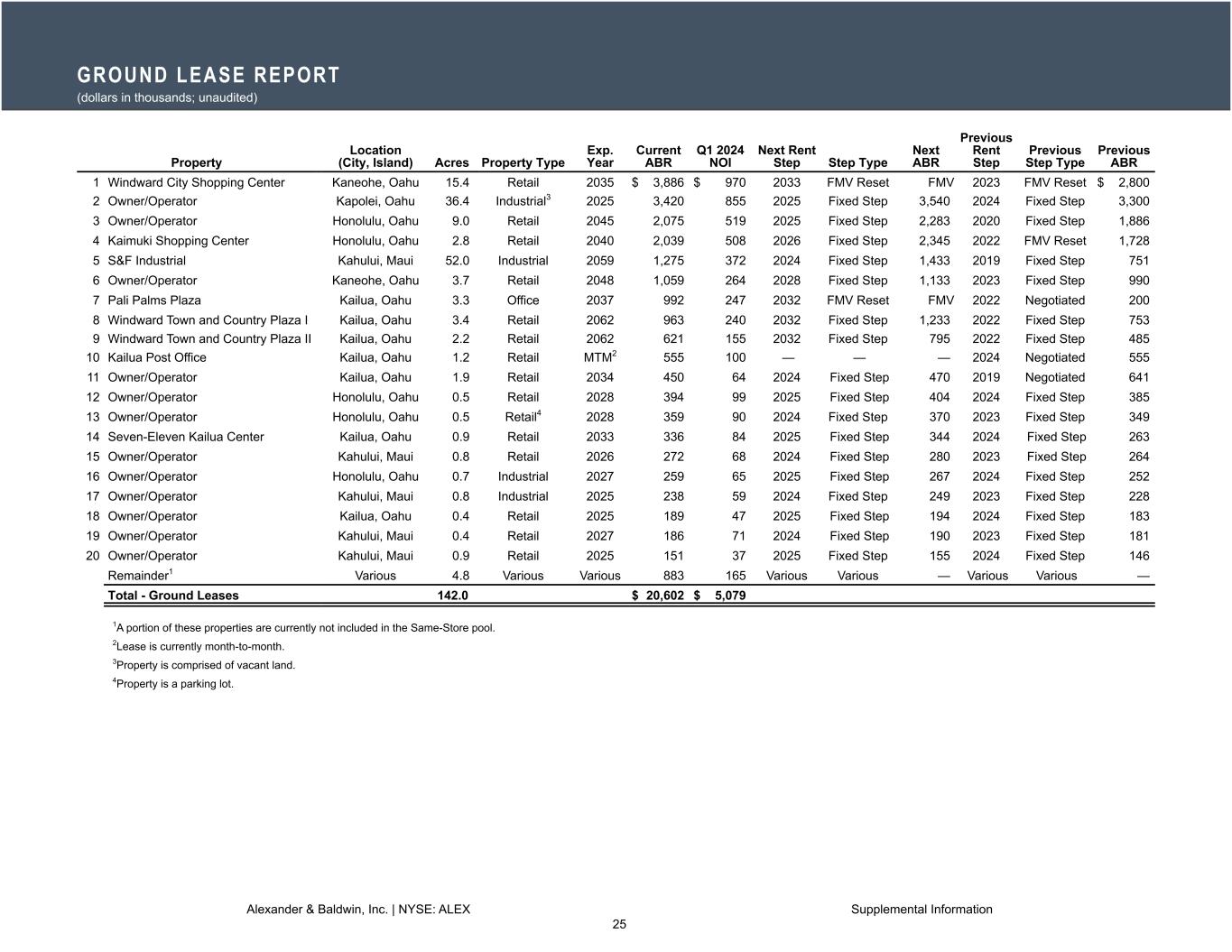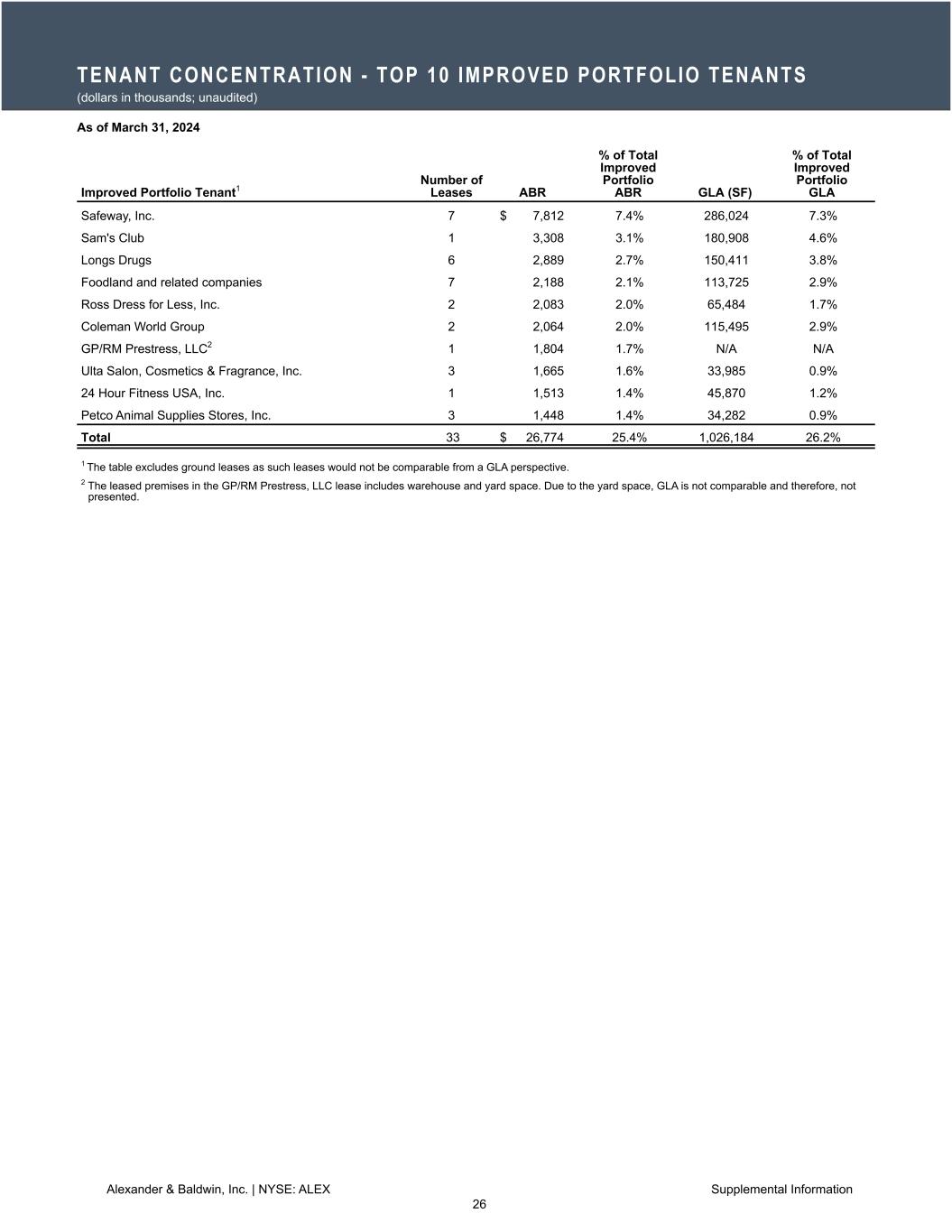 改善的财产报告(千美元,除每平方英尺数据外;未经审计)Industrial:1 Komohana Industrial Park Oahu 238,300100.0% 100.0% $ 3,682 $ 15.45 $ 1,4755.6% 2 Kaka ` ako Commerce Center Oahu 197,90083.8% 79.3% 2,33915.04 4581.7% 3 Waipio Industrial Oahu 158,400100.0% 100.0% 2,88918.247532.8% 4 Opule Industrial Oahu 151,500100.0% 100.0% 2,70617.866802.5% 5 P & L Warehouse Maui 104,100100.0% 100.0% 1,66916.03 4361.6% 6 Kapolei Enterprise Center Oahu 93,100100.0% 100.0% 1,65717.81 3901.5% 7 Honokohau Industrial夏威夷岛86,700100.0% 100.0% 1,39916.13 3731.4% 8 Kailua Industrial/Other Oahu 69,00098.0% 89.3% 1,26320.512430.9% 9 Port Allen Center Kauai 64,60093.3% 93.3% 80613.36 2230.8% 10 Harbor Industrial Maui 51,10094.9% 94.9% 63413.08 1550.6% 11 Kaomi Loop Industrial2 Oahu 33,200100.0% 100.0% 52715.85 1330.5% 12 Kahai Street Industrial Oahu 27,900100.0% 100.0% 40714.60 1510.6% 13 Maui Lani Industrial Maui 8,400100.0% 100.0% 15618.57390.1%小计–工业1,284,20096.8% 95.7% $ 20,134 $ 16.40 $ 5,50920.6%办公室:1 Kahului办公楼毛伊岛59,10078.8% 77.3% $ 1,534 $ 34.56 $ 3521.4% 2 Mililani Mauka South Oahu网关37,100100.0% 100.0% 1,82249.05 4571.7% 3 Kahului办公中心毛伊岛35,80088.5% 88.5% 1,01632.00 2731.0% 4 Lono Center2毛伊岛13,70049.6% 49.6% 19033.32(2)—%小计–办公室145,70083.9% 83.3% $ 4,562 $ 38.34 $ 1,0804.1% 39总计–改善投资组合3,932,10094.0% 92.3% $ 105,614 $ 29.57 $ 26,685100.0% 1 Shadow-anchor tenant 2 property目前不包括在同店池中。Property Island Current GLA(SF)Leased/Economic Occupancy ABR ABR PSF Q1 2024 NOI Q1 2024 % NOI to Improved Portfolio NOI Alexander & Baldwin, Inc. | NYSE:ALEX补充信息24