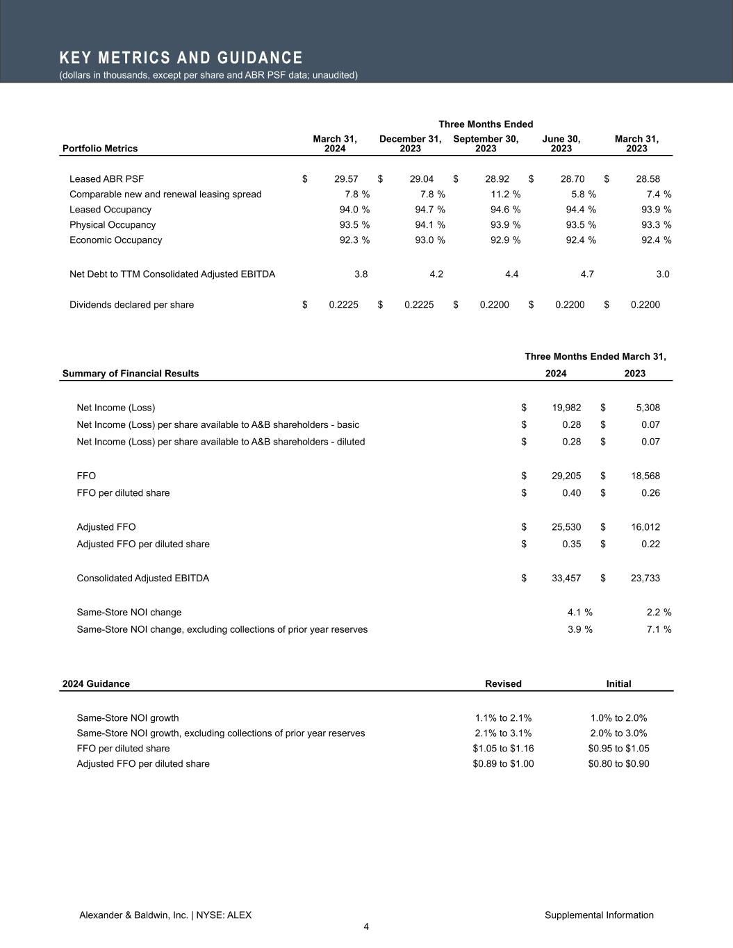 关键指标和指引(以千美元计,每股和ABR PSF数据除外;未经审计)截至三个月的投资组合指标2024年3月31日2023年12月31日2023年9月30日2023年6月30日2023年3月31日,2023租赁ABR PSF $ 29.57 $ 29.04 $ 28.92 $ 28.70 $ 28.58可比新建和续租租赁价差7.8% 7.8% 11.2% 5.8% 7.4%租赁入住率94.0% 94.7% 94.6% 94.4% 93.9%实际入住率93.5% 94.1% 93.9% 93.5% 93.3%经济入住率92.3% 93.0% 92.9% 92.4% 92.4%净债务对TTM合并调整后EBITDA 3.84.24.44.7 4.7 3.0每股宣派股息0.22 25美元0.22 25美元0.2200美元0.2200美元0.2200美元0.2200美元截至3月31日的三个月,20242023年度财务业绩摘要净收入(亏损)19,982美元5,308美元A & B股东可获得的每股净收入(亏损)-基本0.28美元0.07美元A & B股东可获得的每股净收入(亏损)-稀释后0.28美元0.07美元FFO 29,205美元18,568美元FFO每股摊薄收益0.40美元0.26美元调整后FFO 25,530美元16,012美元调整后FFO每股摊薄收益0.35美元0.22美元合并调整后EBITDA 33,457美元23,733美元同店NOI变动4.1% 2.2%同店NOI变动,不包括上一年储备的收款3.9% 7.1% 2024年指引修订初始同店NOI增长1.1%至2.1% 1.0%至2.0%同店NOI增长,不包括上一年储备的收款2.1%至3.1% 2.0%至3.0% FFO每股摊薄收益1.05美元至1.16美元0.95美元至1.05美元调整后FFO每股摊薄收益0.89美元至1.00美元0.80美元至0.90美元Alexander & Baldwin, Inc. |纽约证券交易所:ALEX补充信息4