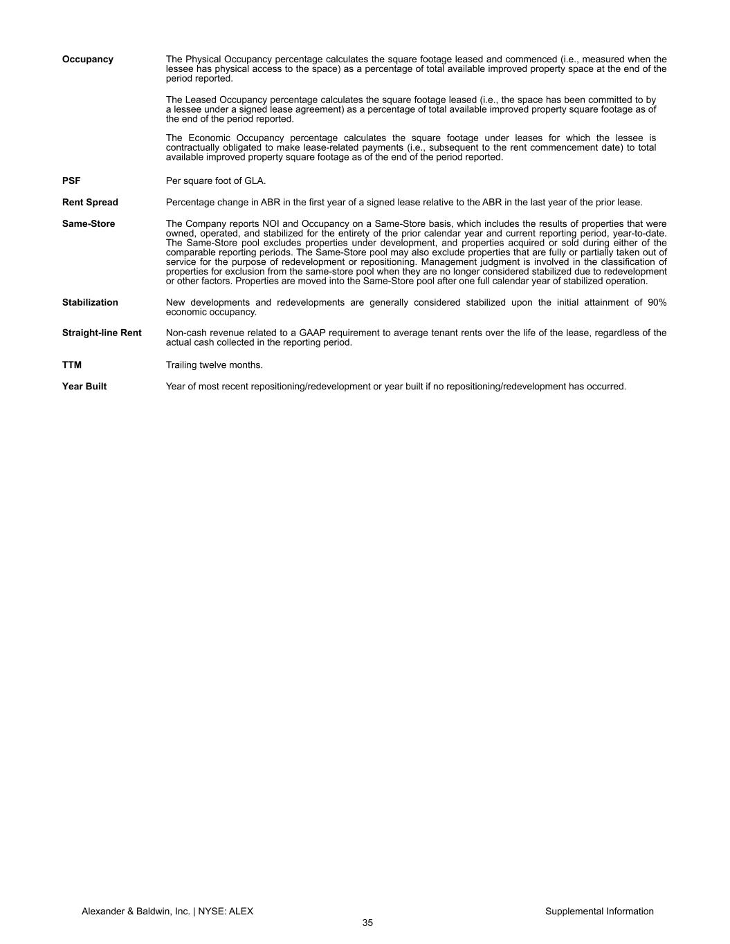 占用情况实际占用百分比计算租赁和开工面积(即在承租人实际进入该空间时计量)占报告所述期间期末可用改善物业空间总数的百分比。租赁占用百分比计算租赁的建筑面积(即承租人根据已签署的租赁协议承诺的空间)占截至报告期间结束时可用的改善物业建筑面积总数的百分比。经济占用百分比计算承租人根据合同有义务支付租赁相关款项(即在租金开始日期之后)的租赁项下的建筑面积与截至报告期间结束时的可用改善物业建筑面积总额。每平方英尺GLA的PSF。已签订租约第一年ABR相对于前一租约最后一年ABR的租金价差百分比变化。同店本公司以同店为基础报告NOI和入住率,其中包括去年至今整个上一个日历年和当前报告期间拥有、经营和稳定的物业的结果。同店池不包括发展中物业,以及在任一可比报告期间收购或出售的物业。同店池也可能排除为重新开发或重新定位而全部或部分停止服务的物业。当物业因重建或其他因素而不再被视为稳定时,管理层判断涉及将物业分类以排除在同店池之外。物业于稳定营运一整日历年后移入同店池。稳定新发展和重建一般认为在初步达到90%的经济占用率时稳定下来。直线式租金非现金收入与GAAP要求相关的租赁期限内的平均租户租金,而不考虑报告期间实际收取的现金。TTM过去十二个月。建成年份最近一次重新定位/重新开发的年份或未发生重新定位/重新开发的年份建成的年份。Alexander & Baldwin, Inc. | NYSE:ALEX补充信息35