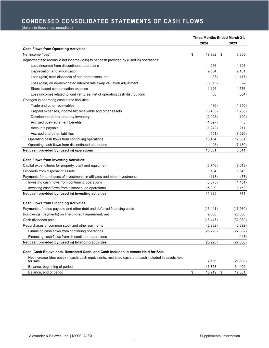 现金流量简明合并报表(单位:千美元;未经审计)截至2024年3月31日的三个月2023年经营活动现金流量:净收入(亏损)19,982美元5,308美元调整以调节净收入(亏损)与经营提供(用于)的现金净额:终止经营的损失(收入)2564,198折旧和摊销9,0349,181非核心资产处置的损失(收益)净额(23)(1,117)非指定利率掉期估值调整的损失(收益)(3,675)—以股份为基础的补偿费用1,1261,576与合营企业相关的损失(收入),经营现金分配净额50(384)经营资产和负债变动:贸易和其他应收款(486)(1,350)预付费用、应收所得税和其他资产(3,435)(1,238)开发/其他财产存货(2,925)(109)应计退休后福利(1,697)5应付账款(1,242)211应计和其他负债(501)(3,620)来自持续经营的经营现金流16,46412,661来自终止经营的经营现金流(403)(7,150)经营提供(用于)的现金净额16,0615,511投资活动产生的现金流:财产资本支出,厂房及设备(3,746)(3,018)资产处置收益1841,645购买联属公司投资款项及其他投资款项(113)(78)投资持续经营现金流量(3,675)(1,451)投资终止经营现金流量15,0002,162投资活动提供(用于)的现金净额11,325711融资活动产生的现金流量:支付应付票据及其他债务和递延融资费用(15,441)(17,960)信贷额度协议借款(款项),已支付现金股利净额9,00025,000(16,447)(32,030)回购普通股和其他款项(2,332)(2,392)来自持续经营业务的筹资现金流(25,220)(27,382)来自已终止经营业务的筹资现金流—(448)筹资活动提供(用于)的现金净额(25,220)(27,830)现金、现金等价物、限制性现金、以及包含在持有待售资产中的现金净增(减)款2,166(21,608)余额,期初13,75334,409余额,期末15,919美元12,801美元Alexander & Baldwin, Inc. |纽约证券交易所:ALEX补充信息8