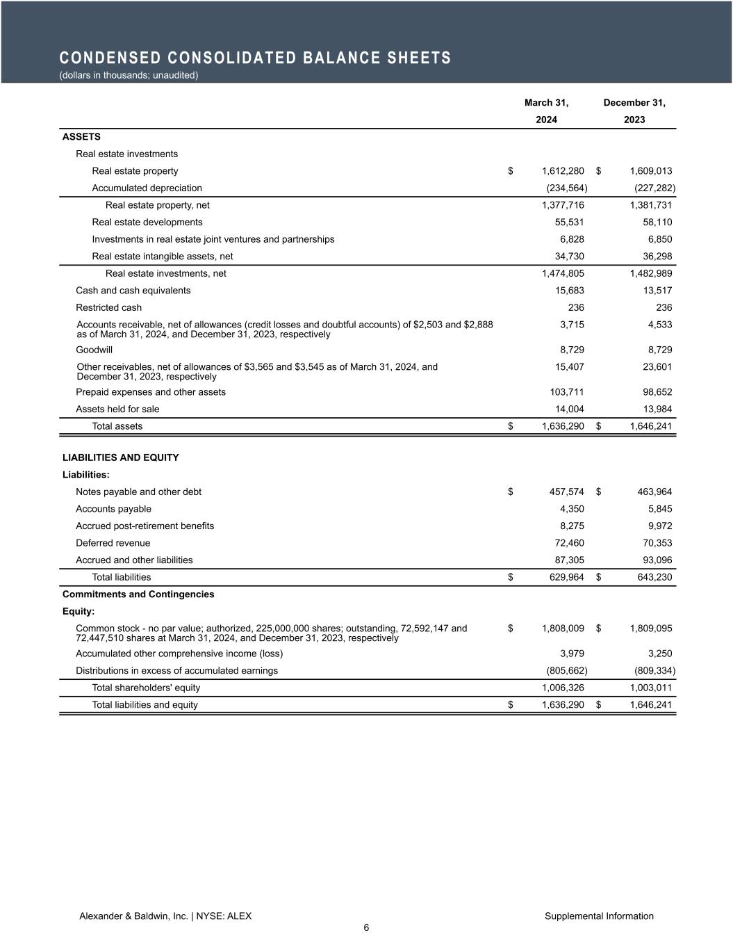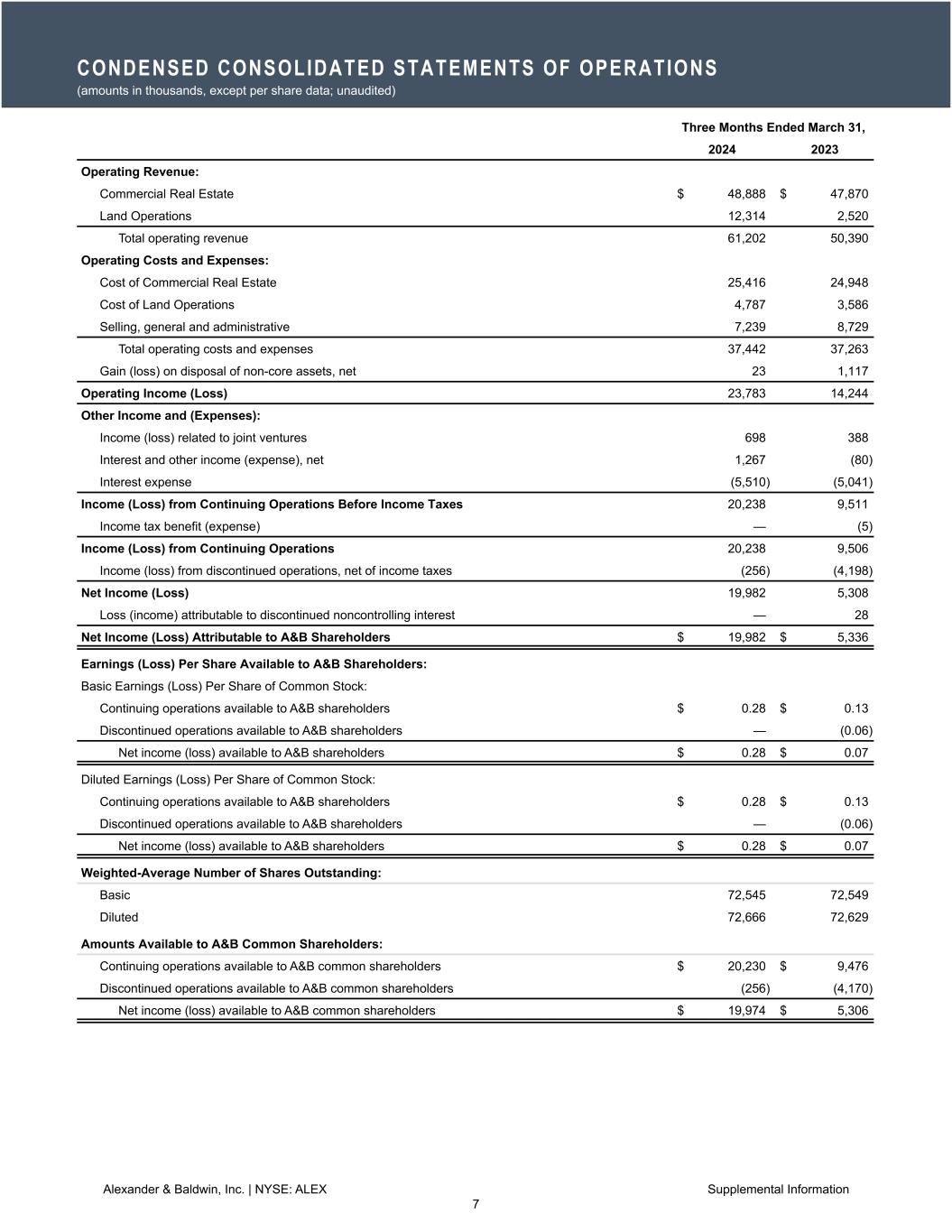 简明合并经营报表(金额以千为单位,每股数据除外;未经审计)截至2024年3月31日的三个月2023年营业收入:商业地产48,888美元47,870美元土地经营12,3142,520总营业收入61,20250,390营业成本和费用:商业地产成本25,41624,948土地经营成本4,7873,586销售、一般和行政费用7,2398,729总营业成本和费用37,44237,263非核心资产处置损益,净额231,117营业收入(亏损)23,78314,244其他收入和(费用):与合营企业相关的收入(亏损)698388利息和其他收入(费用),净额1,267(80)利息支出(5,510)(5,041)所得税前持续经营收入(亏损)20,2389,511所得税收益(费用)——(5)持续经营收入(亏损)20,2389,506终止经营收入(亏损),扣除所得税(256)(4,198)净收入(亏损)19,9825,308归属于已终止非控股权益的亏损(收入)— 28归属于A & B股东的净收入(亏损)19,982美元5,336美元A & B股东可获得的每股收益(亏损):A & B股东可获得的持续经营业务0.28美元0.13美元A & B股东可获得的已终止经营业务——(0.06)A & B股东可获得的净收入(亏损)0.28美元0.07美元稀释后的每股普通股收益(亏损):A & B股东可获得的持续经营业务0.28美元0.13美元A & B股东可获得的已终止经营业务—(0.06)A & B股东可获得的净收入(亏损)0.28美元0.07美元加权平均已发行股数:基本72,54572,549稀释后72,66672,629 A & B普通股股东可获得的金额:A & B普通股股东可获得的持续经营业务20,230美元9,476 A & B普通股股东可获得的已终止经营业务(256)(4,170)A & B普通股股东可获得的净收入(亏损)19,974美元5,306美元Alexander & Baldwin, Inc. |纽约证券交易所代码:ALEX补充信息7