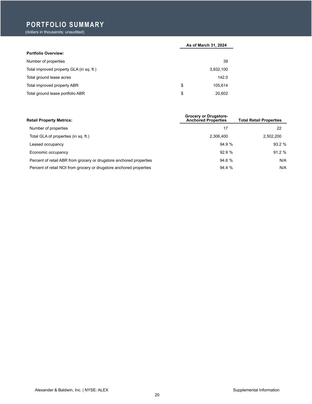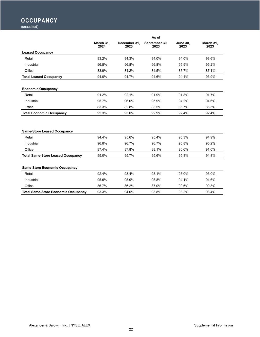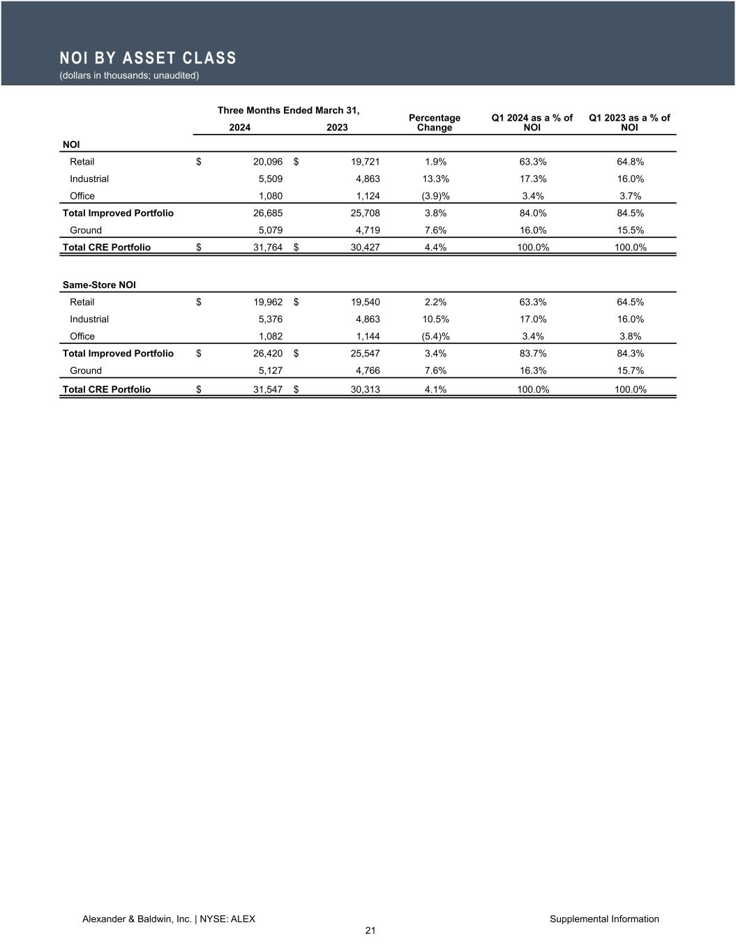 按资产类别划分的NOI(千美元;未经审计)截至3月31日的三个月,2024年第一季度占2023年第一季度NOI的百分比变化占NOI2024的百分比2023 NOI Retail $ 20,096 $ 19,7211.9% 63.3% 64.8% Industrial 5,5094,86313.3% 17.3% 16.0% Office 1,0801,124(3.9)% 3.4% 3.7% Total Improved Portfolio 26,68525,7083.8% 84.0% 84.5% Ground 5,0794,7197.6% 16.0% 15.5% Total CRE Portfolio $ 31,764 $ 30,4274.4% 100.0% 100.0% Same-Store NOI Retail $ 19,962 $ 19,5402.2% 63.3% 64.5% Industrial 5,3764,86310.5% 17.0% 16.0% Office 1,0821,144(5.4)% 3.4% 3.8% Total Improved Portfolio $ 26,420 $ 25,& Baldwin,Inc. | NYSE:ALEX补充信息21