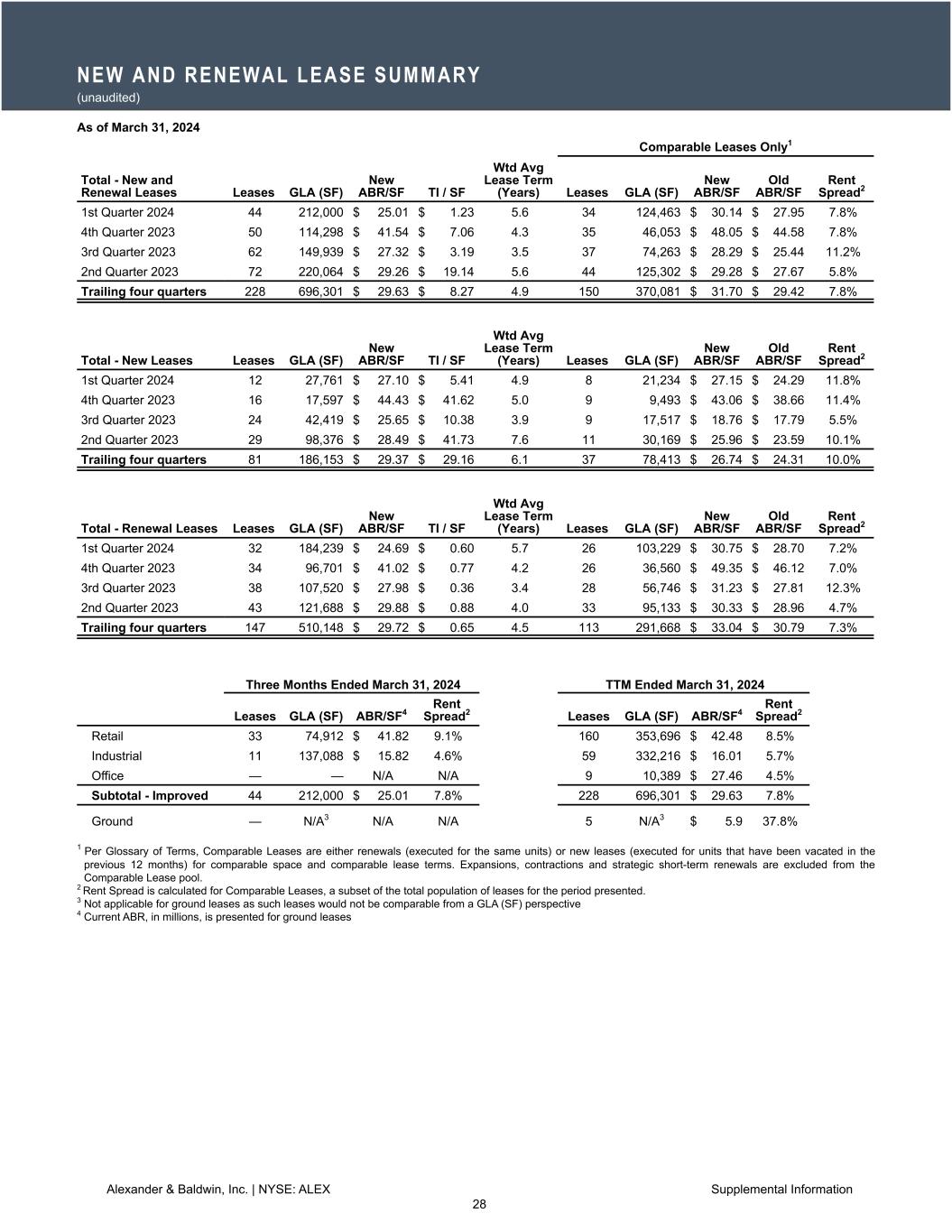 截至3月31日的新租及续租租约概要(未经审核),仅2024年可比租赁1总计-新和Renewal Leases Leases GLA(SF)New ABR/SF TI/SF WTD Avg Lease Term(Years)Leases GLA(SF)New ABR/SF Old ABR/SF Rent Spread2 Q1 Quarter 202444212,000 $ 25.01 $ 1.235.63 4124,463 $ 30.14 $ 27.9 57.8% 4th Quarter 202350114,298 $ 41.54 $ 7.06 4.33546,053 $ 48.05 $ 44.58 7.8% 3rd Quarter 202362149,939 $ 27.32 $ 3.19 3.53774,263 $ 28.29 $ 25.44 11.2% 2nd Quarter 2023722220,064 $ 29.26 $ 19.145.64 4125,302 $ 29.28 $ 27.675.8%$ 8.27 4.9 150370,081 $ 31.70 $ 29.427.8% total-new leases leases GLA(SF)new ABR/SF TI/SF WTD avg lease term(years)leases GLA(SF)new ABR/SF old ABR/SF rent spread2 1st quarter 20241227,761 $ 27.10 $ 5.4 14.98 21,234 $ 27.15 $ 24.29 11.8% 4th quarter 20231617,597 $ 44.43 $ 41.6 25.099,493 $ 43.06 $ 38.66 11.4% 3rd quarter 20232442,419 $ 25.65 $ 10.38 3.99 17,517 $ 18.76 $ 17.79 5.5% 2nd quarter 20232998,$ 25.96 $ 23.59 10.1% Trailing four quarters 81186,153 $ 29.37 $ 29.1 66.13 778,413 $ 26.74 $ 24.31 10.0% total-Renewal leases leases GLA(SF)new ABR/SF TI/SF WTD avg lease term(years)leases GLA(SF)new ABR/SF old ABR/SF rent spread2 1st quarter 202432184,239 $ 24.69 $ 0.605.7 26 103,229 $ 30.75 $ 28.70 7.2% 4th quarter 20233496,701 $ 41.02 $ 0.77 4.22636,560 $ 49.35 $ 46.127.0% 3rd quarter 202338 107,520 $ 27.98 $ 0.36 3.4282023年第二季度43121,688 $ 29.88 $ 0.88 4.03 395,133 $ 30.33 $ 28.96 4.7% Trailing four quarters 147510,148 $ 29.72 $ 0.65 4.5113291,668 $ 33.04 $ 30.79 7.3% Three months ended March 31,2024 TTM ended March 31,2024 Leases GLA(SF)ABR/SF4 Rent Spread2 Leases GLA(SF)ABR/SF4 Rent Spread2 Retail 3374,912 $ 41.8 29.1% 160353,696 $ 42.488.5% Industrial 11137,088 $ 15.8 24.6% 59332,216 $ 16.01 5.7% Office —— N/A N/A 910,389 $ 27.46 4.5%小计-改善44212,000 $ 25.0 7.8% 228696,301 $ 29.637.8% Ground — N/A3 N/A N/A 5 N/A3 $ 5.9 37.8% 1每个术语表,可比租赁要么是续租(针对相同单元执行),要么是新租赁(针对过去12个月内已腾出的单元执行),用于可比空间和可比租赁条款。可比租赁池中不包括扩张、收缩和战略性短期续租。2租金价差是为可比租赁计算的,该租赁是所示期间租赁总数的子集。3不适用于地面租赁,因为从GLA(SF)的角度来看,此类租赁无法进行比较4当前的ABR(以百万计)是针对地面租赁提出的Alexander & Baldwin, Inc. | NYSE:ALEX补充信息28