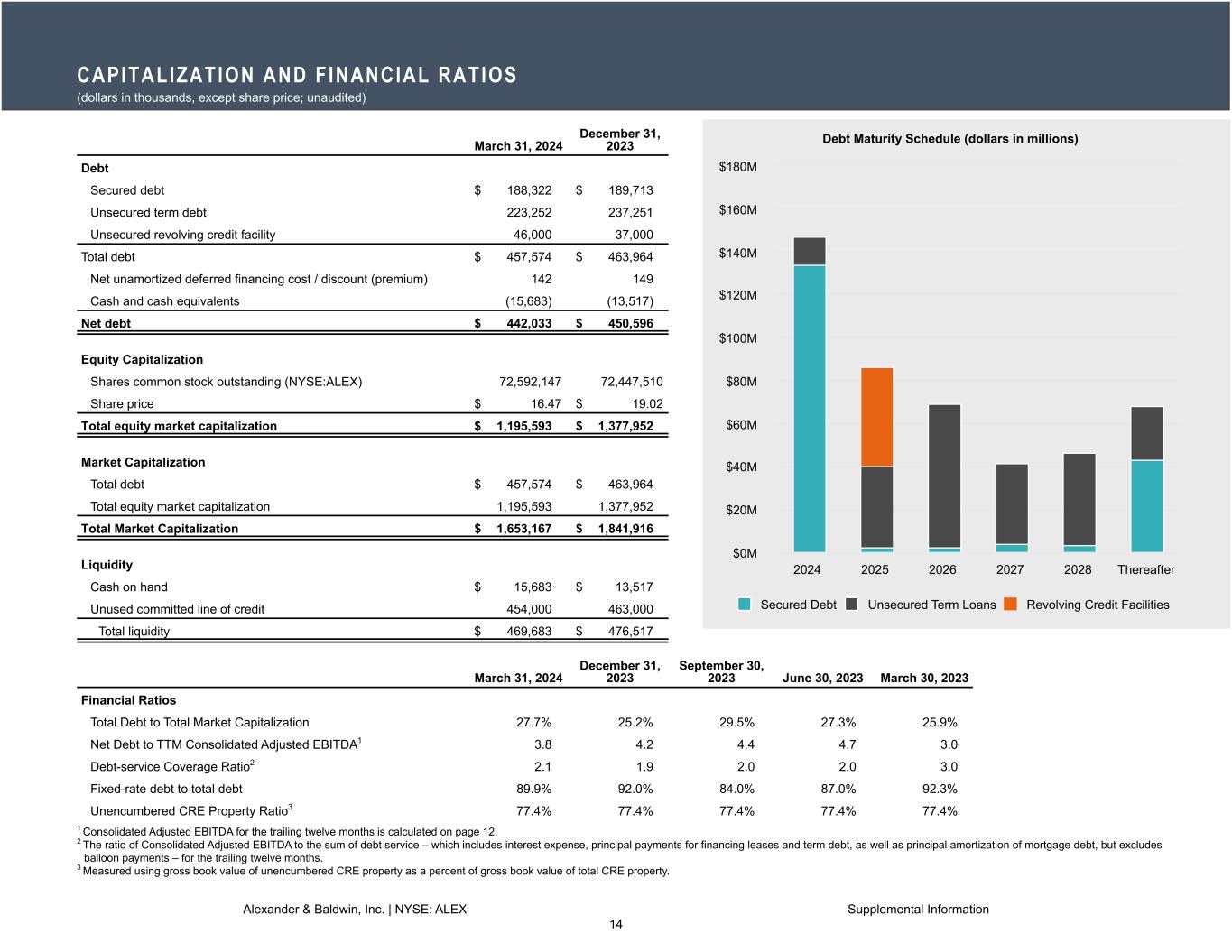 资本化和财务比率(千美元,股价除外;未经审计)2024年3月31日12月31日,2023年债务担保债务188,322美元189,713美元无担保定期债务223,252237,251无担保循环信贷额度46,00037,000总债务457,574美元463,964美元未摊销递延融资成本净额/折扣(溢价)142149现金和现金等价物(15,683)(13,517)净债务$ 442,033 $ 450,596已发行普通股(NYSE:ALEX)72,592,14772,447,510股价格$ 16.47 $ 19.02总股本市值$ 1,195,593 $ 1,377,952总市值$ 457,574 $ 463,964总股本市值$ 1,195,5931,377,952总市值$ 1,653,167 $ 1,841,916流动现金库存$ 15,683 $ 13,517未使用承诺信用额度454,000463,000总流动资金$ 469,683 $ 476,517 March 31,2024 December 31,2023 September 30,2023 June 30,2023 March 302023年财务比率总债务与总市值27.7% 25.2% 29.5% 27.3% 25.9%净债务与TTM合并调整后EBITDA 1 3.84.24.44.7 4.7 3.0偿债覆盖率2 2.1 1.9 2.0 2.0 3.0固定利率债务与总债务的比率89.9% 92.0% 84.0% 87.0% 92.3%未设押CRE财产比率3 77.4% 77.4% 77.4% 77.4% 77.4% 1过去十二个月的合并调整后EBITDA在第12页计算。2过去12个月的合并调整后EBITDA与偿债总额的比率——包括利息支出、融资租赁和定期债务的本金支付,以及抵押债务的本金摊销,但不包括气球付款。3以未设押CRE财产的账面总值占CRE总财产账面总值的百分比计量。Alexander & Baldwin, Inc. | NYSE:ALEX补充信息14债务到期时间表(百万美元)有担保债务无担保定期贷款循环信贷便利20242025202620272028此后000万美元2000万美元4000万美元6000万美元8000万美元1亿美元1.2亿美元1.4亿美元1.6亿美元1.8亿美元