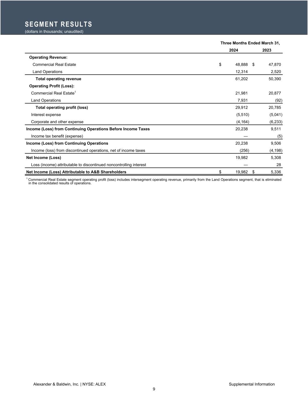 分部业绩(千美元;未经审计)截至2024年3月31日的三个月2023年营业收入:商业地产48,888美元47,870美元土地运营12,3142,520总营业收入61,20250,390营业利润(亏损):商业地产1 21,98120,877土地运营7,931(92)总营业利润(亏损)29,91220,785利息费用(5,510)(5,041)公司及其他费用(4,164)(6,233)所得税前持续经营收入(亏损)20,2389,511所得税收益(费用)—(5)持续经营收入(亏损)20,2389,506终止经营收入(亏损),扣除所得税(256)(4,198)净收入(亏损)19,9825,308归属于已终止非控股权益的亏损(收入)— 28归属于A & B股东的净收入(亏损)19,982美元5,3361商业房地产部门营业利润(亏损)包括主要来自土地运营部门的部门间营业收入,该收入在综合经营业绩中消除。Alexander & Baldwin, Inc. | NYSE:ALEX补充信息9
