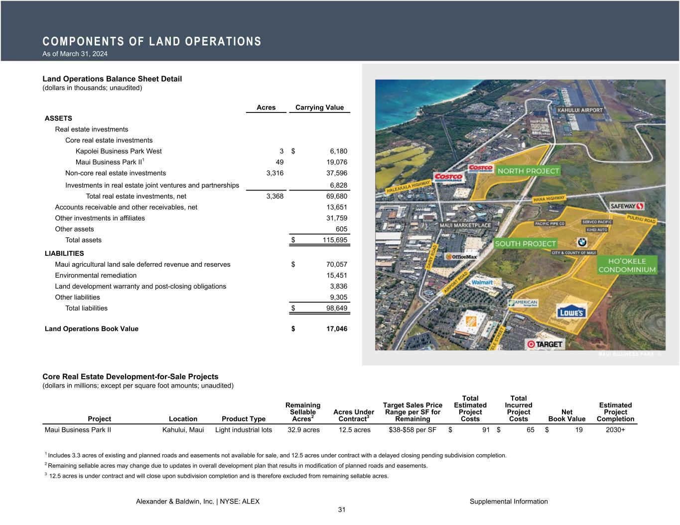 截至2024年3月31日的土地运营构成部分土地运营资产负债表明细(单位:千美元;未经审计)英亩账面价值资产房地产投资核心房地产投资Kapolei Business Park West 3 $ 6,180 Maui Business Park II1 4919,076非核心房地产投资3,31637,596对房地产合资企业和合伙企业的投资6,828房地产投资总额,净额3,36869,680应收账款和其他应收款,对关联公司的其他投资净额13,651其他资产31,759其他资产605总资产115,695美元负债毛伊岛农地出售递延收入和准备金70,057美元环境整治15,451土地开发保修和交割后义务3,836其他负债9,305总负债98,649美元土地运营账面价值17,046美元核心房地产开发待售项目(百万美元;每平方英尺金额除外;未经审计)项目地点产品类型剩余可销售面积2英亩根据合同3目标销售价格范围每平方英尺剩余估计项目总成本总已发生项目成本账面净值估计项目完成毛伊岛商业园II Kahului,毛伊岛轻工业地块32.9英亩12.5英亩$ 38-58每SF $ 91 $ 65 $ 192030 + 1包括3.3英亩现有和计划中的道路和地役权不可出售,以及12.5英亩合同中的延迟关闭等待细分完成。2剩余的可售英亩可能会因整体开发计划的更新而发生变化,从而导致对规划道路和地役权的修改。312.5英亩正在签订合同,将在细分区域完成后关闭,因此不包括在剩余可售英亩范围内。Alexander & Baldwin, Inc. | NYSE:ALEX补充资料31 MAUI BUSINESS PARK I I