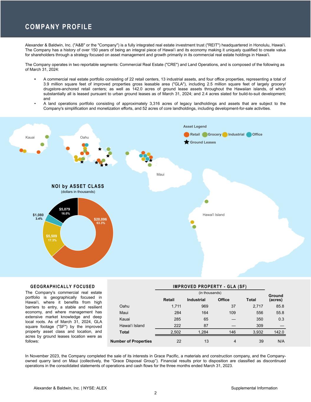 公司简介Alexander & Baldwin, Inc.(“A & B”或“公司”)是一家完全整合的房地产投资信托基金(“REIT”),总部位于夏威夷火奴鲁鲁。该公司拥有150多年的历史,是夏威夷及其经济的组成部分,这使其具有独特的资格,可以通过专注于资产管理和增长的战略为股东创造价值,主要是其在夏威夷持有的商业房地产。该公司经营两个可报告的部门:商业房地产(“CRE”)和土地业务,截至2024年3月31日由以下部门组成:•商业房地产投资组合,包括22个零售中心、13个工业资产和四个办公物业,代表总计390万平方英尺的改善后物业总可出租面积(“GLA”),其中包括250万平方英尺的主要由杂货店/药店锚定的零售中心;以及遍布夏威夷群岛的142.0英亩的土地租赁资产,截至3月31日,其中大部分是根据城市土地租赁出租的,2024年;和2.4英亩计划用于定制开发;•一个土地运营组合,包括约3,316英亩受公司简化和货币化努力影响的遗留土地所有权和资产,以及52英亩的核心土地所有权,包括开发出售活动。以地理为重点的改良物业-GLA(SF)(单位:千)地(英亩)零售工业办公室总计Oahu 1,711969372,71785.8毛伊岛28416410955655.8考艾岛28565 — 3500.3 Hawai‘i岛22287 — 309 —总计2,5021,2841463,932142.0物业数量2213439不适用于2023年11月,公司完成出售其于材料和建筑公司Grace Pacific的权益,以及公司在毛伊岛拥有的采石场土地(统称“Grace处置集团”)。截至2023年3月31日止三个月的综合经营和现金流量表将处置前财务业绩分类为已终止经营业务。Alexander & Baldwin, Inc. | NYSE:ALEX Supplemental Information 2 Asset Legend Retail Grocery Industrial Office Ground Leases Kauai Oahu Maui Hawai'i Island $ 20,096 $ 5,509 $ 1,080 $ 5,079该公司的商业房地产投资组合地理位置集中在夏威夷,该地区受益于较高的进入壁垒、稳定且有韧性的经济,并且该地区的管理层拥有广泛的市场知识和深厚的当地根基。截至2024年3月31日,按经改善物业资产类别及位置划分的GLA建筑面积(“SF”)、按地面租赁位置划分的占地面积如下:16.0% 63.3% 17.3% 3.4%按资产类别划分的NOI(单位:千美元)