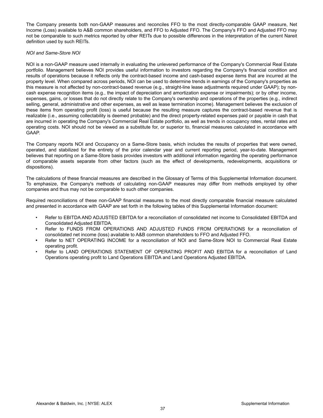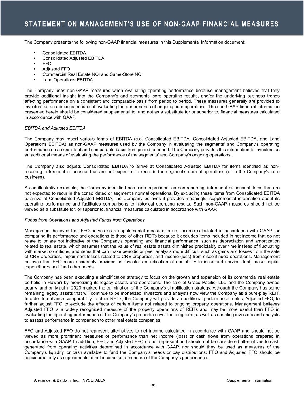 关于管理层使用非公认会计准则财务指标的声明公司在本补充信息文件中提出了以下非公认会计准则财务指标:•合并EBITDA •合并调整后EBITDA • FFO •调整后FFO •商业房地产NOI和同店NOI •土地运营EBITDA公司在评估经营业绩时使用非公认会计准则指标,因为管理层认为,它们提供了对公司和分部核心经营业绩的额外洞察,和/或在不同时期的一致和可比基础上影响业绩的基本业务趋势。这些措施一般提供给投资者,作为评估正在进行的核心业务绩效的额外手段。此处提供的非GAAP财务信息应被视为对根据GAAP计算的财务指标的补充,而不是替代或优于。EBITDA和调整后EBITDA公司可能会报告各种形式的EBITDA(例如合并EBITDA、合并调整后EBITDA和土地运营EBITDA),作为公司在不同时期以一致和可比的基础评估分部和公司经营业绩时使用的非公认会计原则衡量标准。公司向投资者提供这些信息,作为评估分部业绩和公司持续经营的额外手段。公司还对合并EBITDA进行调整,以得出被确定为非经常性、不经常或不寻常的项目的合并调整后EBITDA,这些项目预计不会在该部门的正常运营(或公司的核心业务)中重复发生。作为一个说明性例子,公司将非现金减值确定为非经常性、不经常或不寻常的项目,这些项目预计不会在合并或分部的正常运营中重复发生。通过将这些项目从合并EBITDA中剔除以得出合并调整后EBITDA,公司认为这提供了有关其经营业绩的有意义的补充信息,并有助于与历史经营业绩进行比较。此类非公认会计原则措施不应被视为替代或优于根据公认会计原则计算的财务措施。来自运营的资金和来自运营管理部门的调整后资金认为,FFO可作为根据GAAP计算的净收入的补充衡量标准,用于将其业绩和运营与其他REITs的业绩和运营进行比较,因为它不包括净收入中包含的与公司运营和财务业绩无关或不具有指示性的项目,例如与房地产相关的折旧和摊销,其中假设房地产资产的价值会随着时间的推移而可预测地减少,而不是随市场情况波动,以及可能使定期或同行分析更加困难的项目,例如出售CRE物业的损益、与CRE物业相关的减值损失以及终止经营业务的收入(亏损)。管理层认为,FFO更准确地向投资者提供了我们承担和偿还债务、进行资本支出和为其他需求提供资金的能力的指标。该公司一直在执行简化战略,通过将其遗留资产和运营货币化,专注于其在夏威夷的商业房地产投资组合的增长和扩张。2023年出售Grace Pacific,LLC和公司在毛伊岛拥有的采石场土地标志着公司简化战略的高潮。尽管该公司还有一些剩余的遗留资产将继续货币化,但投资者和分析师现在将该公司视为纯粹的房地产投资信托基金。为了增强与其他REITs的可比性,公司将提供一个额外的绩效指标,即调整后的FFO,以进一步调整FFO,以排除与正在进行的物业运营无关的某些项目的影响。管理层认为,调整后的FFO是一种被广泛认可的衡量REITs物业运营的指标,在评估公司物业的长期运营业绩方面可能比FFO更有用,并使投资者和分析师能够与其他房地产公司相比评估业绩FFO和调整后的FFO并不代表根据GAAP计算的净收入的替代方案,不应被视为比根据GAAP编制的净收入(亏损)或运营现金流更突出的业绩衡量指标。此外,FFO和调整后的FFO不代表也不应被视为根据公认会计原则确定的经营活动产生的现金的替代品,也不应将其用作衡量公司流动性的指标,或可用于为公司需求提供资金或支付分配的现金。FFO和调整后的FFO应仅被视为对净收入的补充,作为衡量公司业绩的一个指标。亚历山大&鲍德温, Inc. |纽交所:ALEX补充信息36