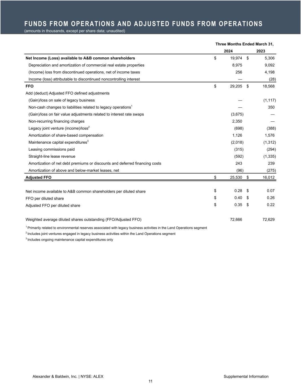 来自运营的资金和来自运营的调整后资金(以千为单位,每股数据除外;未经审计)截至2024年3月31日的三个月2023年A & B普通股股东可获得的净收入(亏损)19,974美元5,306美元商业房地产物业折旧和摊销8,9759,092(收入)终止经营的亏损,扣除所得税2564,198归属于已终止非控股权益的收入(亏损)—(28)FFO $ 29,205 $ 18,568加(减)调整后FFO定义调整(收益)/出售遗留业务的损失—(1,117)与遗留业务相关的负债的非现金变动1 — 350(收益)/与利率掉期相关的公允价值调整损失(3,675)—非经常性融资费用2,350 —遗留合营企业(收益)/亏损2(698)(388)以股份为基础的补偿摊销1,1261,576维持性资本支出3(2,018)(1,312)支付的租赁佣金(315)(294)直线租赁收入(592)(1,335)净债务溢价或折价的摊销和递延融资成本243239高于和低于市场租赁的摊销,净额(96)(275)调整后FFO 25,530美元16,012美元A & B普通股股东可获得的每股摊薄收益0.28美元0.07美元FFO每股摊薄收益0.40美元0.26美元调整后FFO每股摊薄收益0.35美元0.22美元加权平均摊薄流通股(FFO/调整后FFO)72,66672,6291主要与土地运营分部的遗留业务活动相关的环境储备2包括在土地运营分部内从事遗留业务活动的合资企业3仅包括持续的维护资本支出Alexander & Baldwin, Inc. |纽约证券交易所代码:ALEX补充信息11