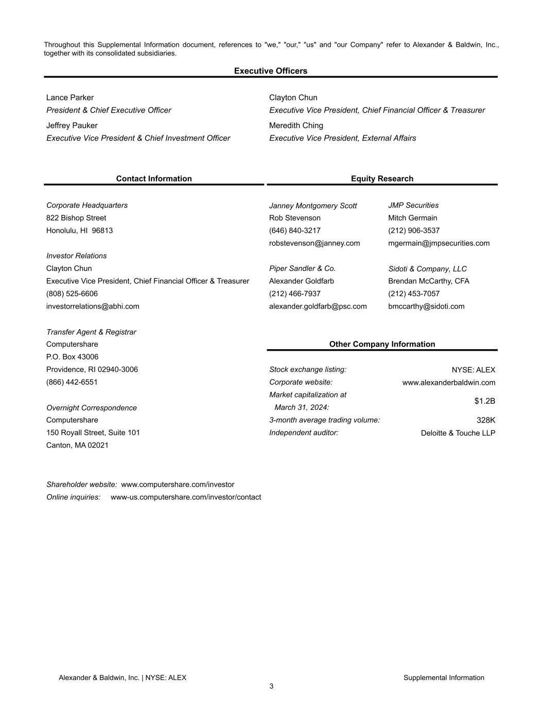 在本补充信息文件中,对“我们”、“我们的”、“我们”和“我们的公司”的提及是指Alexander & Baldwin, Inc.,连同其合并子公司。执行官Lance Parker Clayton Chun总裁兼首席执行官执行副总裁、首席财务官兼财务主管Jeffrey Pauker Meredith Ching执行副总裁兼首席投资官执行副总裁,对外事务联系信息Equity Research Corporation Headquarters Janney Montgomery Scott JMP Securities 822 Bishop Street Rob Stevenson Mitch Germain Honolulu,HI 96813(646)840-3217(212)906-3537 robstevenson@janney.com mgermain@jmpsecurities.com投资者关系Clayton Chun丨Piper Sandler Piper Sandler & Co. Sidoti & Company,LLC执行副总裁、丨首席财务官首席财务官 &财务主管Alexander Goldfarb Brendan McCarthy,CFA(808)525-6606(212)466-7937(212)453-7057investorrelations@abhi.com alexander.goldfarb@psc.com bmccarthy@sidoti.com转让代理和注册商Computershare其他公司信息P.O. Box 43006 Providence,RI 02940-3006证券交易所上市:NYSE:ALEX(866)442-6551公司网站:www.alexanderbaldwin.com市值$ 1.2B隔夜通讯2024年3月31日:Computershare 3个月平均交易量:328K 150 Royall Street,Suite 101独立审计师:Deloitte & Touche LLP Canton,MA 02021股东网站:www.computershare.com/investor在线查询:www-us