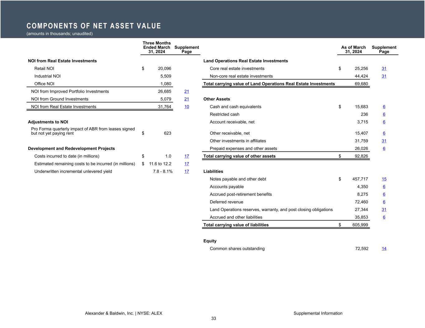 资产净值构成部分(金额以千为单位;未经审计)截至2024年3月31日止三个月补充页截至3月31日,2024年补充页NOI来自房地产投资土地业务房地产投资零售NOI 20,096美元核心房地产投资25,25631美元工业NOI 5,509非核心房地产投资44,42431办公室NOI 1,080土地业务总账面价值房地产投资69,680 NOI来自改善的投资组合26,68521 NOI来自地面投资5,07921其他资产NOI来自房地产投资31,76410现金和现金等价物15,6836受限制的现金2366调整NOI应收账款,已签订但尚未支付租金的租赁产生的ABR净额3,7156备考季度影响623美元其他应收款,净额15,4076对附属公司的其他投资31,75931开发和再开发项目预付费用和其他资产26,0266迄今发生的成本(百万美元)$ 1.017其他资产的账面价值总额$ 92,826估计将发生的剩余成本(百万美元)$ 11.6至12.217承保的增量无杠杆收益率7.8-8.1 % 17负债应付票据和其他债务$ 457,71715应付账款4,3506应计退休后福利8,2756递延收入72,4606土地运营准备金、保修、和交割后债务27,34431应计和其他负债35,8536负债账面价值总额605,999美元已发行普通股权益72,59214 Alexander & Baldwin, Inc. | NYSE:ALEX补充信息33