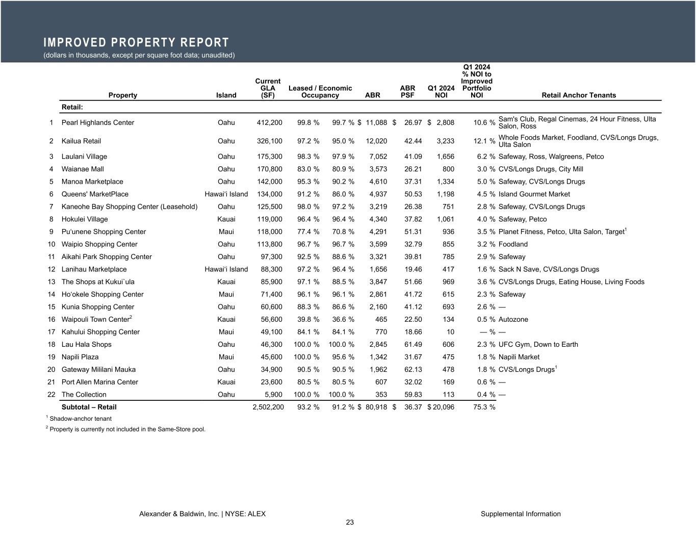 改进的财产报告(以千美元计,每平方英尺数据除外;未经审计)零售:1珍珠高地中心瓦胡岛412,20099.8% 99.7% $ 11,088 $ 26.97 $ 2,80810.6%山姆会员店、富豪电影院、24小时健身、Ulta沙龙、Ross 2 Kailua零售瓦胡岛326,10097.2% 95.0% 12,02042.443,23312.1% 全食超市、Foodland、CVS/Longs Drugs、Ulta Salon 3 Laurani Village Oahu 175,30098.3% 97.9% 7,05241.091,6566.2% Safeway,Ross,Walgreens,Petco 4 Waianae Mall Oahu 170,80083.0% 80.9% 3,57326.2 18003.0%丨CVSCity Mill 5 Manoa MarketPlace Oahu 142,00095.3% 90.2% 4,61037.311,3345.0% Safeway,CVS/Longs Drugs 6 Queens‘MarketPlace Hawai’i Island 134,00091.2% 86.0% 4,93750.531,1984.5% Island Gourmet Market 7 Kaneohe Bay Shopping Center(leasehold)Oahu 125,50098.0% 97.2% 3,21926.387512.8% Safeway,CVS/Longs Drugs 8 Hokulei Village Kauai 119,00096.4% 96.4% 4,34037.82 1,0614.0% Safeway,Petco 9 Pu'unene Shopping Centre Maui 118,00077.4% 70.8% 4,29151.319363.5% 星球健身,Petco,UltaTarget110 Waipio购物中心Oahu 113,80096.7% 96.7% 3,59932.7 98553.2% Foodland 11 Aikahi Park购物中心Oahu 97,30092.5% 88.6% 3,32139.81 7852.9% Safeway 12 Lanihau Marketplace Hawai‘i Island 88,30097.2% 96.4% 1,656 19.46 4171.6% Sack N Save,CVS丨/long drugs 13 the shops at Kukui ` ula Kauai 85,90097.1% 88.5% 3,84751.66 9693.6%丨/long drugs,eating house,Living Foods 14 Ho‘okele购物中心毛伊岛71,40096.1% 96.1% 2,86141.7 26152.3% Safeway 15 Kunia购物中心瓦胡岛60,60088.3% 86.6% 2,16041.12693 2.6% — 16 Waipouli Town Center2 Kauai 56,60039.8% 36.6% 46522.50 1340.5% Autozone 17 Kahului购物中心毛伊岛49,10084.1% 84.1% 77018.66 10 —% — 18 Lau Hala Shops瓦胡岛46,300100.0% 100.0% 2,84561.49 6062.3% UFC健身房,脚踏实地19 Napili Plaza Maui 45,600100.0% 95.6% 1,34231.67 4751.8% Napili Market 20 Gateway Mililani Mauka Oahu 34,90090.5% 90.5% 90.5% 1,96262.13 4781.8% Long Drugs1 21 Port Allen Marina Center Kauai 23,60080.5% 80.5% 60732.02 1690.6% — 22 The Collection Oahu 5,900100.0% 100.0% 35359.83 1130.4% —小计–零售2,502,20093.2% 91.2% $ 80,918 $ 36.37 $ 20,09675.3% 1 Shadow-anchor tenant 2 property目前不包括在同店池中。Property Island当前GLA(SF)租赁/经济占用ABR ABR PSF 2024年第一季度NOI 2024年第一季度NOI % NOI以改善投资组合NOI零售锚定租户Alexander & Baldwin, Inc. | NYSE:ALEX补充信息23