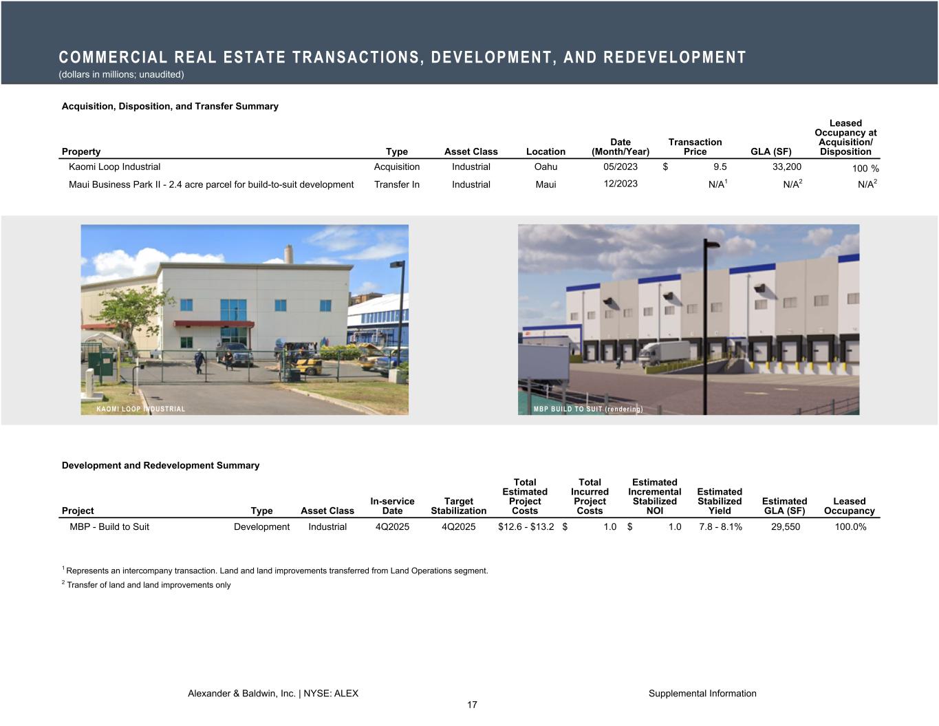 商业房地产交易、开发、再开发(百万美元;未经审计)收购、处置、和转让摘要物业类型资产类别位置日期(月/年)交易价格GLA(SF)在收购/处置时租赁占用Kaomi Loop Industrial Acquisition Industrial Oahu 05/2023 $ 9.533,200100% Maui Business Park II-2.4英亩宗地用于在Industrial Maui进行定制开发转让12/2023 N/A1 N/A2 N/A2 Development和重建摘要项目类型资产类别在役日期目标稳定总估计项目成本总发生项目成本估计增量稳定NOI估计稳定收益率估计GLA(SF)租赁占用MBP-Build to Suit Development Industrial 4Q2025 4Q2025 $ 12.6-$ 13.2 $ 1.0 $ 1.07.8-8.1% 29,550100.0% 1代表公司间交易。从土地运营分部转让的土地和土地改良。2转让土地和土地改良仅Alexander & Baldwin, Inc. | NYSE:ALEX补充资料17 KAOMI Loop Industrial MBP Build to SUIT(render ing)
