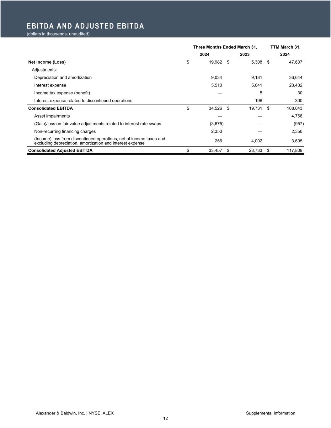 EBITDA和调整后EBITDA(单位:千美元;未经审计)截至3月31日的三个月,TTM 2024年3月31日2023年2024年净收入(亏损)19,982美元5,308美元47,637美元调整:折旧和摊销9,0349,18136,644利息费用5,5105,04123,432所得税费用(收益)— 530与终止经营相关的利息费用— 196300合并EBITDA 34,526美元19,731美元108,043美元资产减值——与利率掉期相关的公允价值调整(收益)/损失(3,675)—(957)非经常性融资费用2,350 — 2,350(收入)终止经营的损失,扣除所得税且不包括折旧、摊销和利息费用2564,0023,605合并调整后EBITDA 33,457美元23,733美元117,809美元Alexander & Baldwin, Inc. | NYSE:ALEX补充信息12