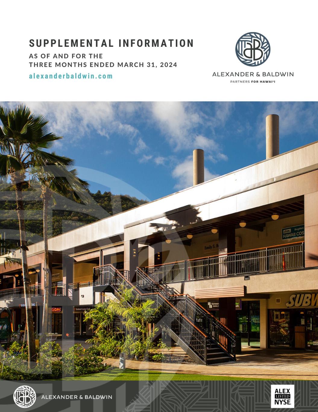 Alexander & Baldwin, Inc.报告2024年第一季度业绩夏威夷州檀香山(2024年4月25日)/美通社/— Alexander & Baldwin, Inc.(纽约证券交易所代码:ALEX)(“A & B”或“公司”)是一家位于夏威夷的夏威夷优质商业地产的所有者、运营商和开发商,今天宣布,A & B普通股股东可获得的净收入为2000万美元,或稀释后每股收益0.28美元,商业房地产(“CRE”)2024年第一季度的营业利润为2200万美元。2024年第一季度亮点•运营资金(“FFO”)为2920万美元,合稀释后每股0.40美元/调整后FFO为2550万美元,合稀释后每股0.35美元• CRE同店净营业收入(“NOI”)增长4.1%/CRE同店NOI增长3.9%,不包括上一年储备的收款•截至2024年3月31日,租赁入住率为94.0% •总裁兼首席执行官Lance Parker表示:“我们在今年开始时取得了全面的强劲业绩。第一季度CRE同店NOI增长4.1%,我们继续看到对我们高质量零售和工业物业的强劲租赁需求,本季度混合可比租赁利差为7.8%。我们的土地运营部门也表现良好,产生了790万美元的运营利润,这主要是由于一些机会主义的土地销售。因此,我们正在上调2024年全年指引,以反映我们第一季度的业绩。”2024年第一季度财务业绩• 2024年第一季度A & B普通股股东可获得的净收入和A & B股东可获得的稀释后每股收益分别为2000万美元和0.28美元,而2023年同季度的稀释后每股收益分别为530万美元和0.07美元。• A & B股东2024年第一季度可获得的持续经营收入为2020万美元,合稀释后每股收益0.28美元,而2023年同季度为950万美元,合稀释后每股收益0.13美元。• 2024年第一季度FFO和稀释后每股FFO分别为2920万美元和0.40美元,而2023年同季度为1860万美元和稀释后每股0.26美元。FFO和稀释后每股FFO受益于2024年第一季度更高的土地运营利润率,这主要是由于出售了约330英亩的土地持有。相比之下,2023年同一季度出售了一英亩土地。• 2024年第一季度调整后的FFO和调整后的稀释后每股FFO分别为2550万美元和0.35美元,而2023年同季度为1600万美元和0.22美元。CRE 2024年第一季度亮点• CRE 2024年第一季度营业收入增长1.0百万美元,或2.1%,至4890万美元,而2023年同季度为4790万美元。• CRE 2024年第一季度营业利润增加110万美元,或5.3%,至2200万美元,而2023年同季度为2090万美元。i