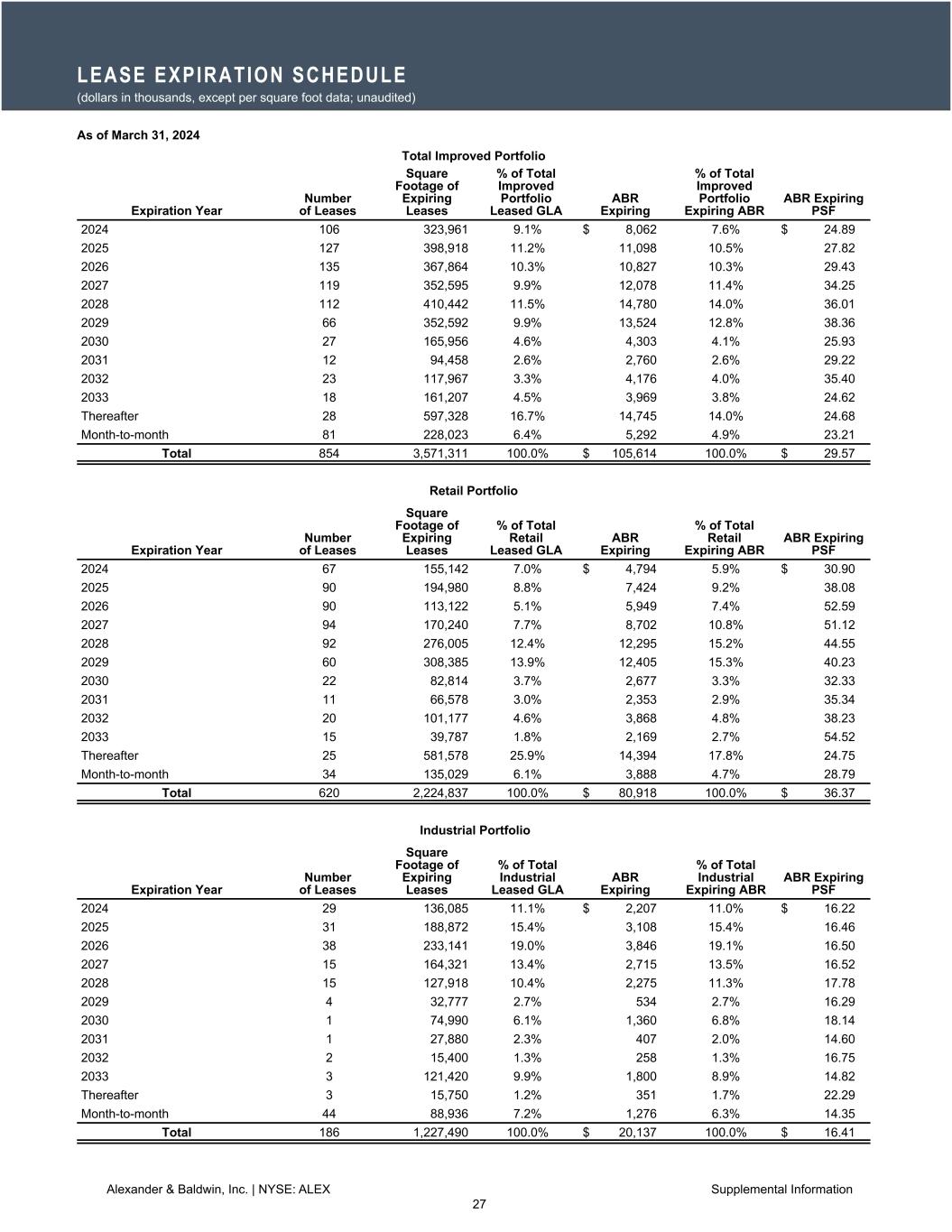 租户集中-截至2024年3月31日改善投资组合租户的前10名(单位:千美元;未经审计)1租赁数量ABR占总改善投资组合的百分比ABR GLA(SF)%占总改善投资组合的百分比GLA Safeway,Inc. 7 $ 7,8127.4% 286,0247.3% Sam's Club 13,3083.1% 180,9084.6% Longs Drugs 62,8892.7% 150,4113.8% Foodland and related companies 72,1882.1% 113,7252.9% Ross Dress for Less,Inc. 22,0832.0% 65,4841.7% Coleman World Group 22,0642.0% 115,4952.9% GP/RM Prestress,LLC2 11,8041.7%Cosmetics & Fragrance,Inc. 31,6651.6% 33,9850.9% 24 Hour Fitness USA,Inc. 11,5131.4% 45,8701.2% Petco Animal Supplies Stores,Inc. 31,4481.4% 34,2820.9% Total 33 $ 26,77425.4% 1,026,18426.2% 1 The table excludes ground leases as such leases would not be comparable from the perspective of GLA。2 GP/RM Prestress,LLC租赁中的租赁房地包括仓库和堆场空间。由于院子空间的原因,GLA不具有可比性,因此,不呈现。Alexander & Baldwin, Inc. | NYSE:ALEX补充资料26