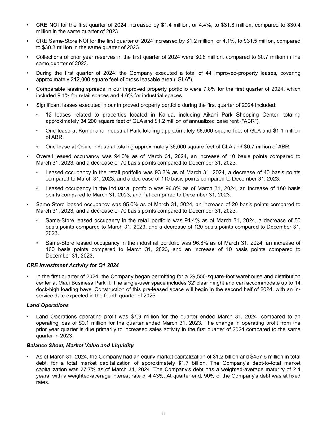 • 2024年第一季度CRE NOI增加140万美元,或4.4%,至3180万美元,而2023年同季度为3040万美元。• CRE 2024年第一季度同店NOI增加120万美元,或4.1%,至3150万美元,而2023年同季度为3030万美元。• 2024年第一季度上一年准备金的收款为80万美元,而2023年同季度为70万美元。•在2024年第一季度,公司共执行了44项改善型物业租赁,总可出租面积(“GLA”)约为212,000平方英尺。• 2024年第一季度,我们改善后的物业组合的可比租赁利差为7.8%,其中包括9.1%的零售空间和4.6%的工业空间。•在2024年第一季度,我们改进后的物业组合中执行的重要租赁包括:⑤ 12份与位于Kailua的物业相关的租赁,包括Aikahi Park购物中心,总计约34,200平方英尺的GLA和120万美元的年化基本租金(“ABR”)。⑤ Komohana工业园的一份租约,总计约68,000平方英尺的GLA和110万美元的ABR。⑤ Opule Industrial的一份租约总计约36,000平方英尺的GLA和70万美元的ABR。•截至2024年3月31日,整体租赁出租率为94.0%,较2023年3月31日增加10个基点,较2023年12月31日减少70个基点。⑤截至2024年3月31日,零售组合的租赁入住率为93.2%,与2023年3月31日相比下降40个基点,与2023年12月31日相比下降110个基点。⑤截至2024年3月31日,工业投资组合的租赁入住率为96.8%,与2023年3月31日相比增加160个基点,与2023年12月31日相比持平。•截至2024年3月31日,同店租赁出租率为95.0%,较2023年3月31日增加20个基点,较2023年12月31日减少70个基点。⑤截至2024年3月31日,零售组合中的同店租赁入住率为94.4%,与2023年3月31日相比下降50个基点,与2023年12月31日相比下降120个基点。⑤截至2024年3月31日,工业投资组合中的同店租赁入住率为96.8%,与2023年3月31日相比增加160个基点,与2023年12月31日相比增加10个基点。2024年第一季度CRE投资活动• 2024年第一季度,公司开始许可在毛伊岛商业园II建造一个29,550平方英尺的仓库和配送中心。单用户空间包括32 '净高,可容纳多达14个码头高的装货舱。这一预租空间的建设将于2024年下半年开始,预计在2025年第四季度投入使用。土地运营•截至2024年3月31日的季度,土地运营运营利润为790万美元,而截至2023年3月31日的季度运营亏损为10万美元。营业利润较上年同期的变化主要是由于与2023年同季度相比,2024年第一季度的销售活动有所增加。资产负债表、市值和流动性•截至2024年3月31日,该公司的股票市值为12亿美元,总债务为4.576亿美元,总市值约为17亿美元。截至2024年3月31日,该公司的债务与总市值之比为27.7%。公司债务加权平均期限2.4年,加权平均利率4.43%。季度末,公司90%的债务为固定利率。ii