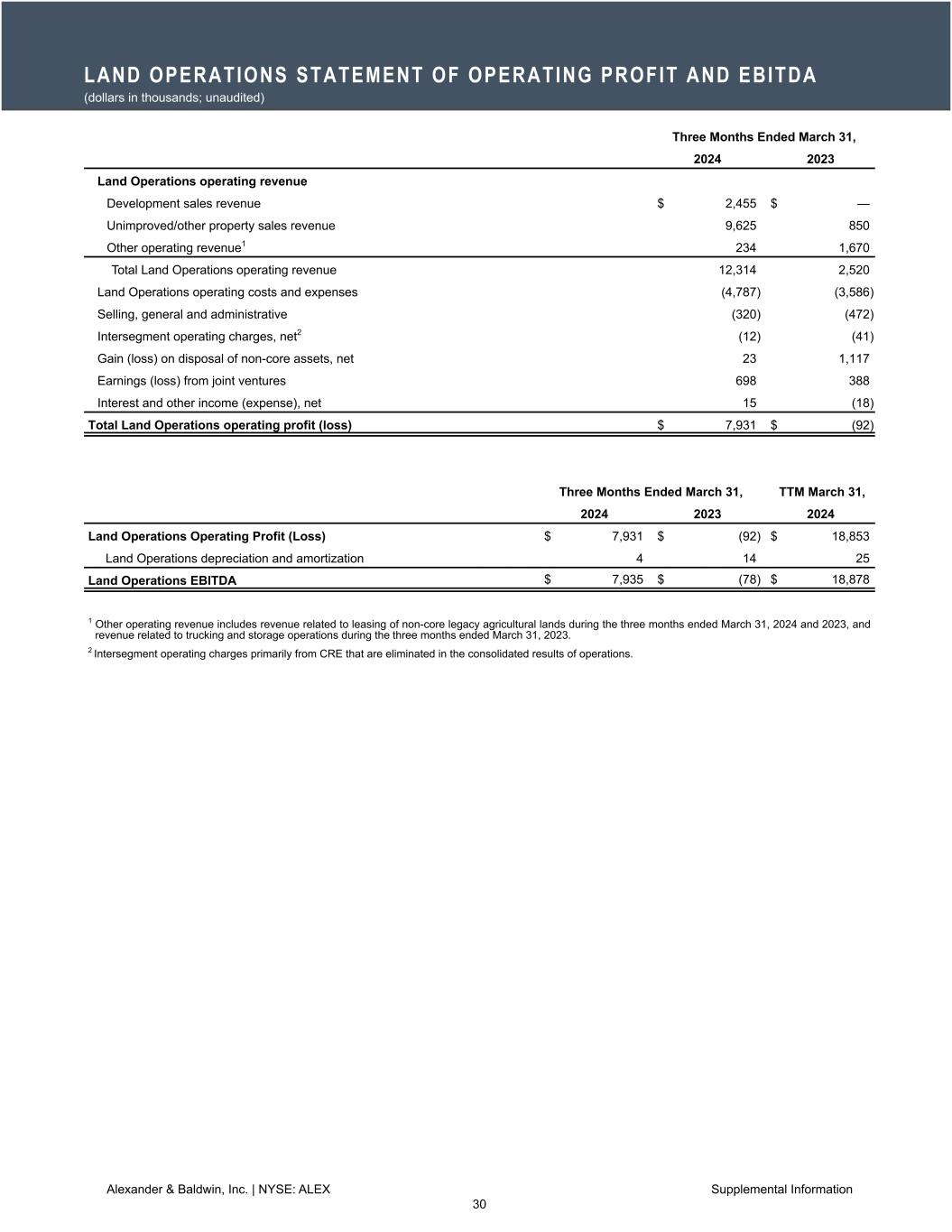土地运营运营运营利润和EBITDA报表(单位:千美元;未经审计)截至2024年3月31日的三个月2023年土地运营运营运营收入开发销售收入$ 2,455 $ —未改善/其他物业销售收入9,625850其他运营收入12341,670土地运营运营总运营收入12,3142,520土地运营运营运营运营成本和费用(4,787)(3,586)销售、一般和行政(320)(472)分部间运营费用,净额2(12)(41)非核心资产处置收益(亏损),净额231,117来自合营企业的收益(亏损)698388利息和其他收入(费用),Net 15(18)Total Land Operations Operating Profit(loss)$ 7,931(92)截至3月31日止三个月TTM 2024年3月31日2023年2024年Land Operations Operating Profit(loss)$ 7,931 $(92)$ 18,853 Land Operations Depreciation and Amortization 41425 Land Operations EBITDA $ 7,935 $(78)$ 18,8781其他经营收入包括截至2024年3月31日和2023年3月31日止三个月与租赁非核心遗留农业用地相关的收入,以及截至2023年3月31日止三个月与卡车运输和仓储业务相关的收入。2主要来自CRE的分部间运营费用在综合经营业绩中消除。Alexander & Baldwin, Inc. | NYSE:ALEX补充信息30