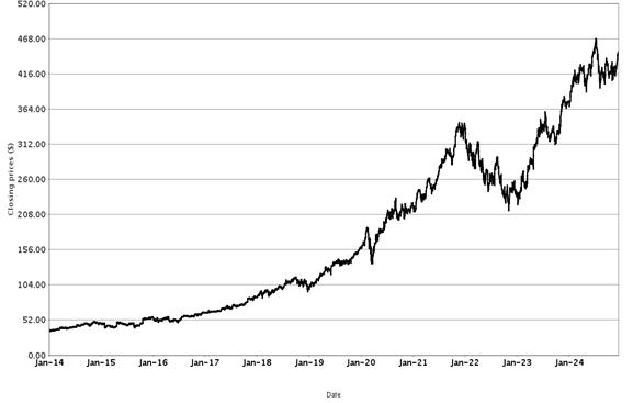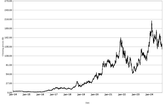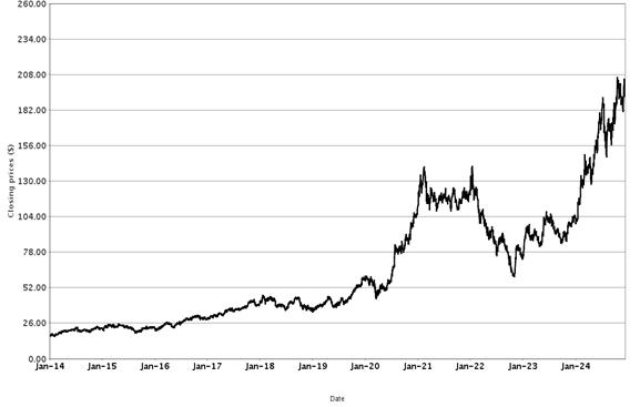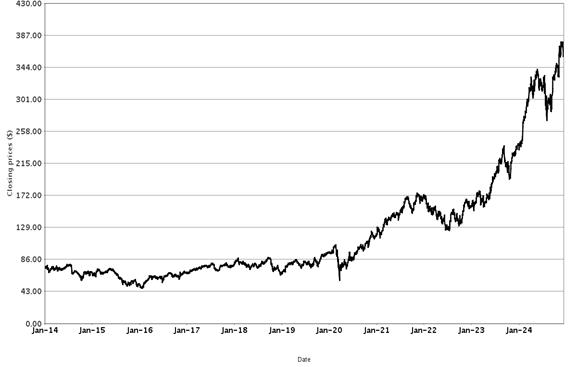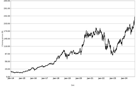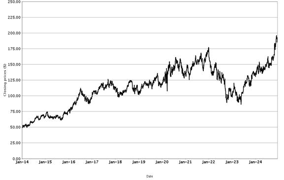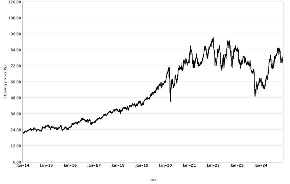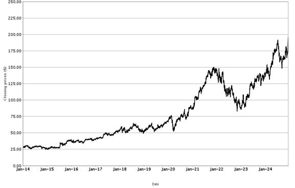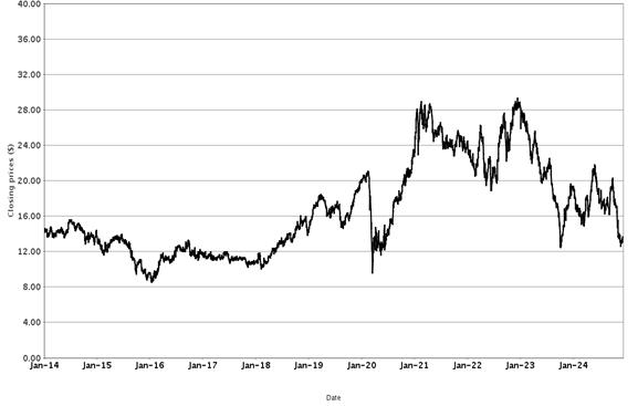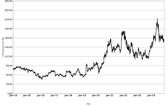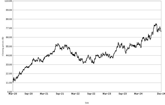 以下图表列出了从2014年1月1日(或从初始上市日期,如果更晚)到2024年12月11日期间篮子基础证券的历史收盘价。我们从彭博金融市场获得图表中的信息,未经独立调查。我们无法向您保证,篮子底层证券的表现将导致您的所有初始投资的回报。