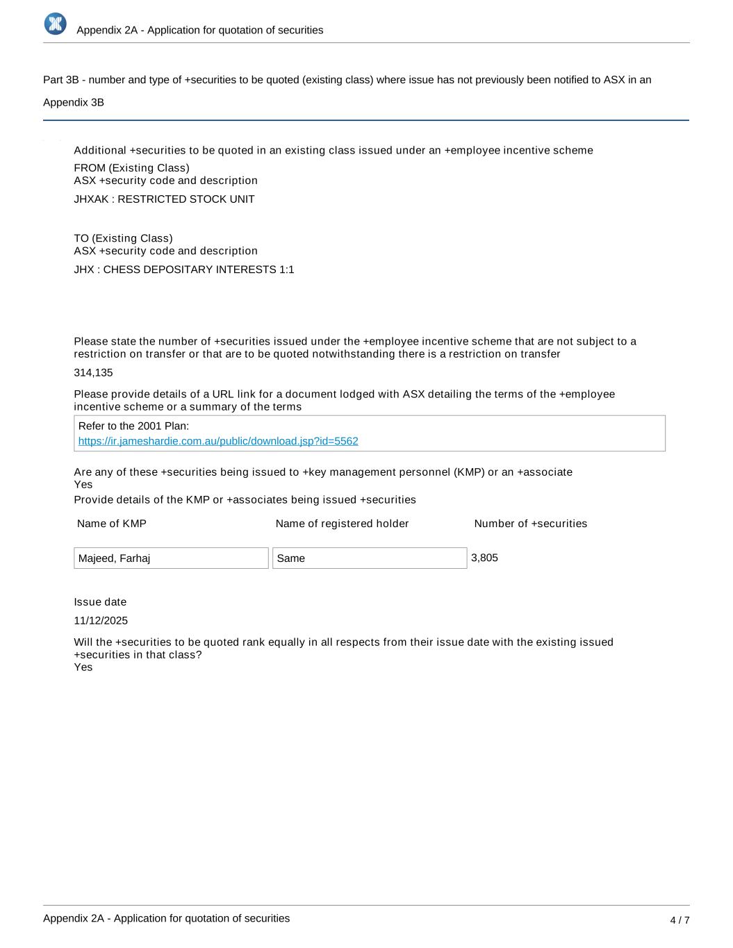 附录2A-证券报价申请附录2A-证券报价申请4/7第3B部分-先前未在附录3B中向ASX通知发行的拟报价+证券(现有类别)的数量和类型附加+证券将在根据+员工激励计划发行的现有类别中报价从(现有类别)TERM0 +证券代码和说明JHXAK:限制性股票单位到(现有类别)ASX +证券代码及说明JHX:CHESS存管权益1:1请说明根据+员工激励计划发行的不受转让限制的+证券数量或尽管有转让限制但仍要报价的314,135请提供向ASX提交的文件的URL链接的详细信息,该文件详细说明了+员工激励计划的条款或条款摘要,请参阅2001年计划:https://ir.jameshardie.com.au/public/download.jsp?id=5562这些+证券中的任何一种是否正在向+关键管理人员(KMP)或+联系人发行提供KMP或+正在发行的联系人的详细信息+证券名称KMP注册持有人+证券Majeed的数量,Farhaj Same 3,805发行日期11/12/2025拟报价的+证券自发行日期起在所有方面的排名是否与该类别中现有已发行+证券的排名相同?有有有有有有有有有有有有有有有有有有有有有有有有有有有有有有有有有有有有有有有有有有有有有有有有有有有