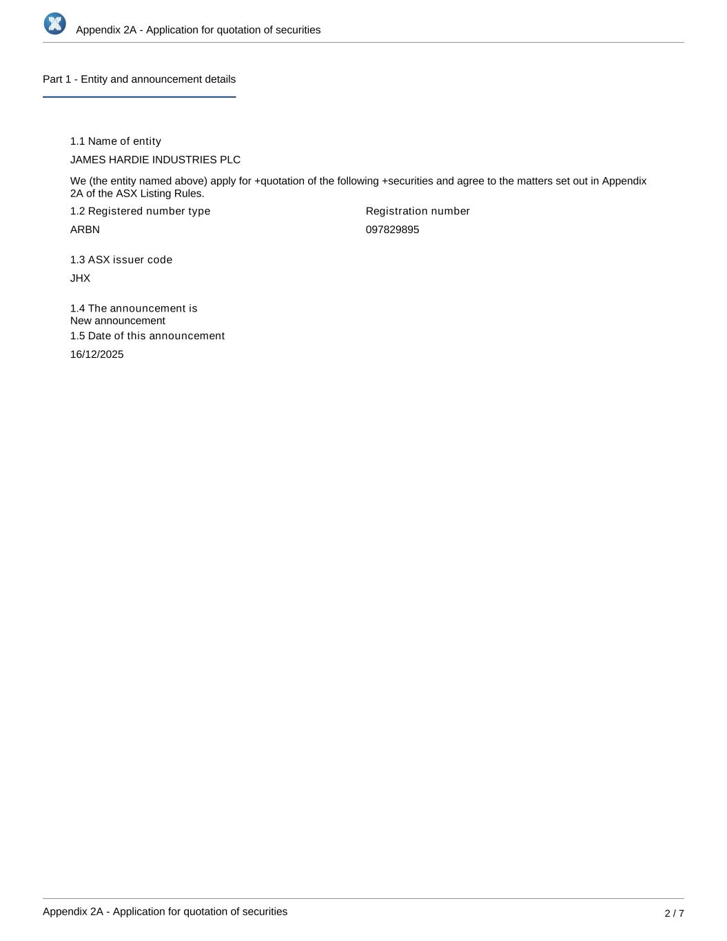 附录2A-证券报价申请附录2A-证券报价申请2/7第1部分-主体及公告详情1.1主体名称JAMES HARDIE INDUSTRIES PLC我们(上述实体)申请+报价以下+证券,并同意《ASX上市规则》附录2A所列事项。1.2注册号类型ARBN注册号0978298951.3 ASX发行人代码JHX 1.4该公告为1.5本公告日期16/12/2025新公告