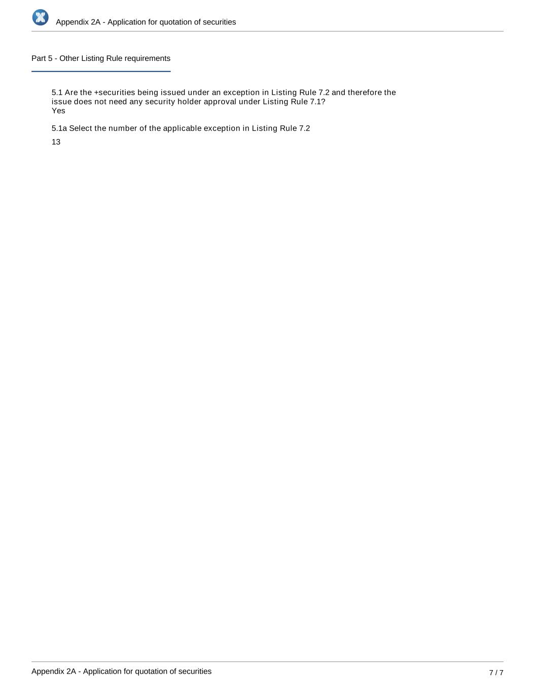 附录2A-证券报价申请附录2A-证券报价申请7/7第5部分-其他上市规则要求5.1 +证券是否根据上市规则第7.2条的例外情况发行,因此发行不需要根据上市规则第7.1条的任何证券持有人批准?5.1a选择上市规则7.2中适用例外的编号13是