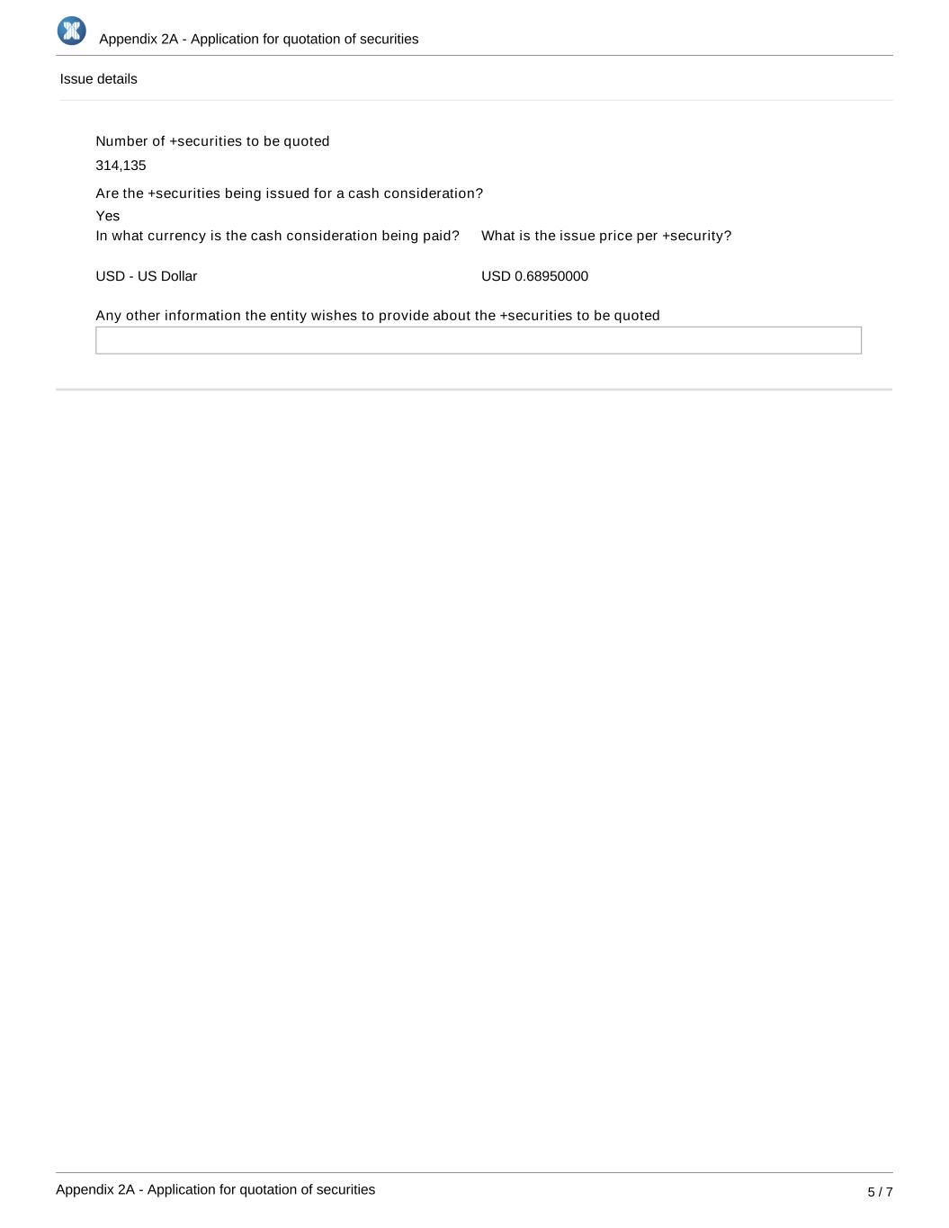 附录2A-证券报价申请书附录2A-证券报价申请书5/7发行详情+证券报价数量314,135 +证券是否为现金对价发行?现金对价以什么货币支付?美元-美元每+证券发行价是多少?0.68 950000美元实体希望提供的有关拟报价的+证券的任何其他信息是