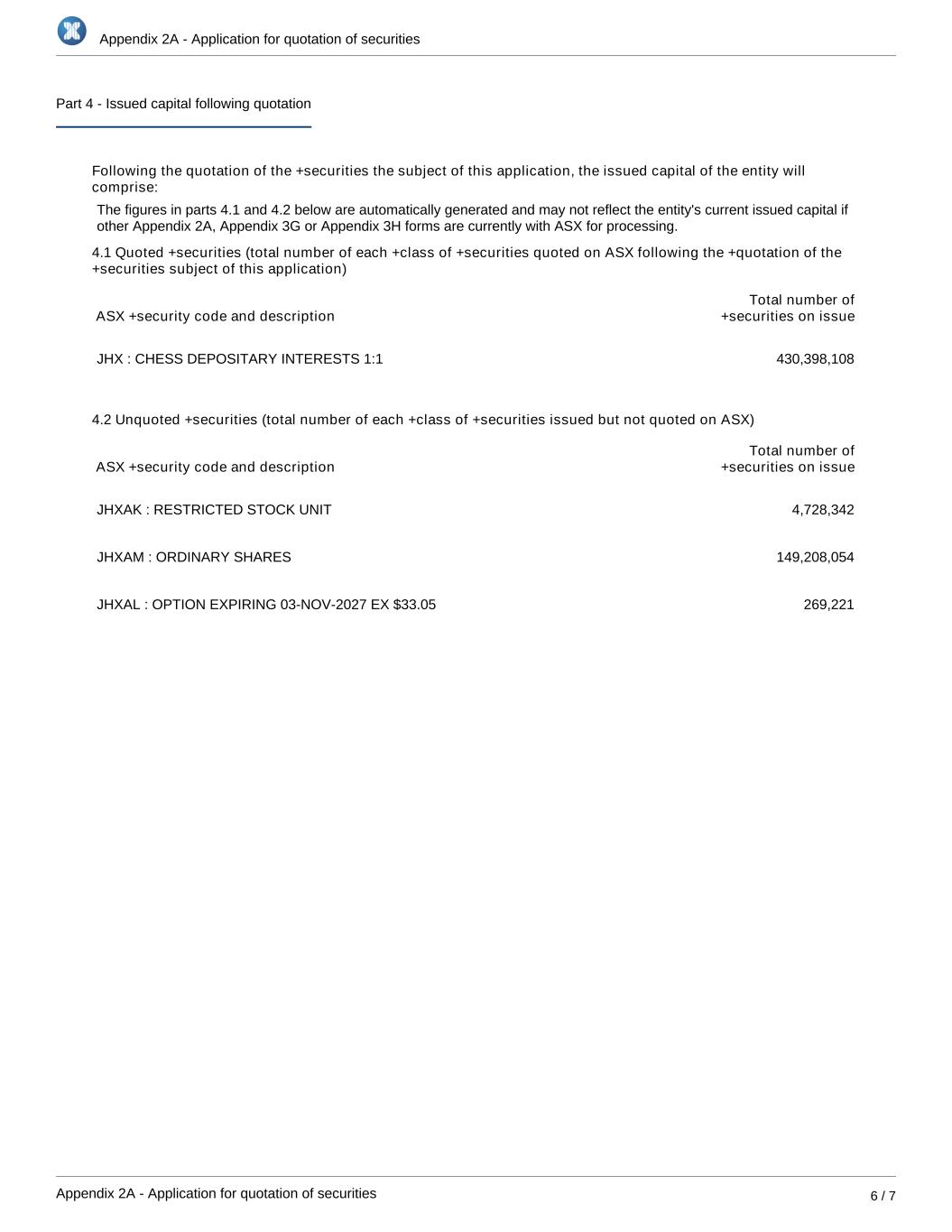 附录2A-证券报价申请附录2A-证券报价申请6/7第4部分-已发行资本继本申请标的的+证券报价后,实体的已发行资本将包括:下文第4.1和4.2部分中的数字是自动生成的,如果其他附录2A、附录3G或附录3H表格目前由ASX处理,则可能无法反映实体当前的已发行资本。4.1已报价+证券(各+类别+证券在ASX报价的总数跟随+本申请的+证券标的报价)ASX +证券代码及说明+已发行证券的总数TERM0:JHX:CHESS存托权益1:1430,398,1084.2未报价+证券(各类别总数+已发行但未在ASX报价的证券)ASX +证券代码及说明已发行+证券的总数JHXAK:限制性股票单位4,728,342 JHXAM:普通股149,208,054 JHXAL:期权将于2027年11月3日EX 33.05 269美元到期