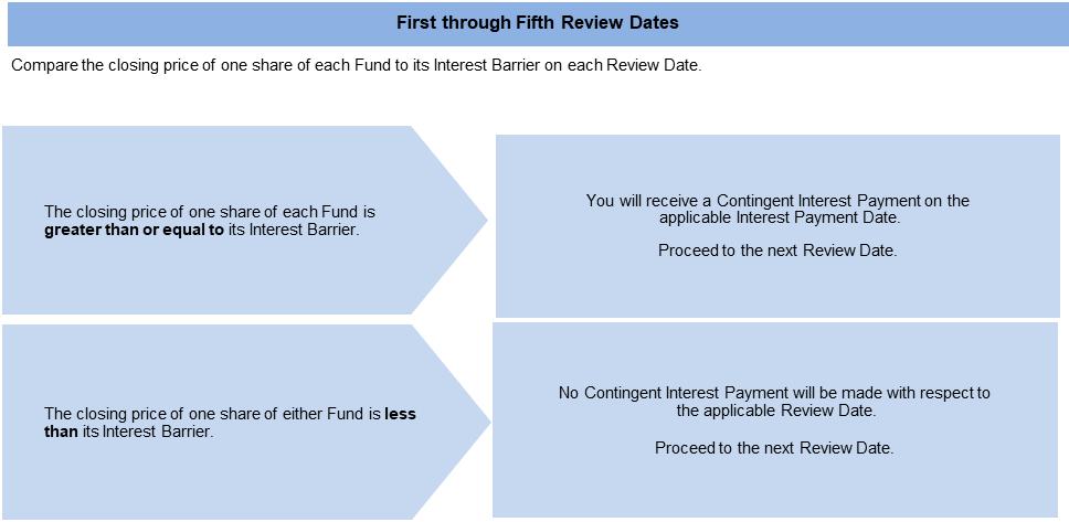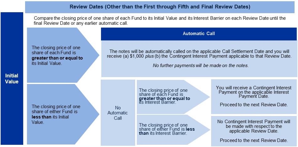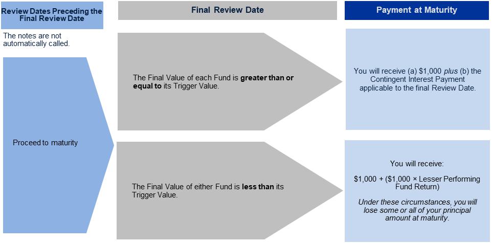 由于票据未被自动赎回,且表现较差基金的最终价值大于或等于其触发值,因此,每张本金金额为1,000美元的票据的到期付款将为1,009.625美元(或1,000美元加上适用于最终审查日期的或有利息付款)。如果加上先前审查日期收到的或有利息付款,每张1000美元本金票据支付的总金额为1028.875美元。