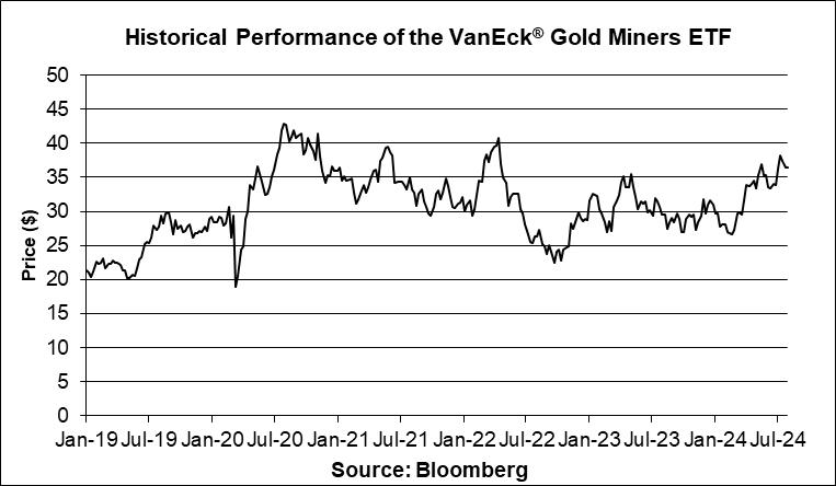 下图以2019年1月4日至2024年8月2日每只基金一份额的周历史收盘价为基础,分别列出了各基金的历史业绩表现。ARK创新ETF2024年8月2日1份的收盘价为41.21美元。VanEck的一股股票的收盘价®2024年8月2日黄金矿工ETF36.48美元。我们从Bloomberg Professional获得了收盘价的上、下®服务(“彭博”),未经独立核实。收盘价格高于和低于可能是彭博调整了基金采取的行动,如股票拆分。