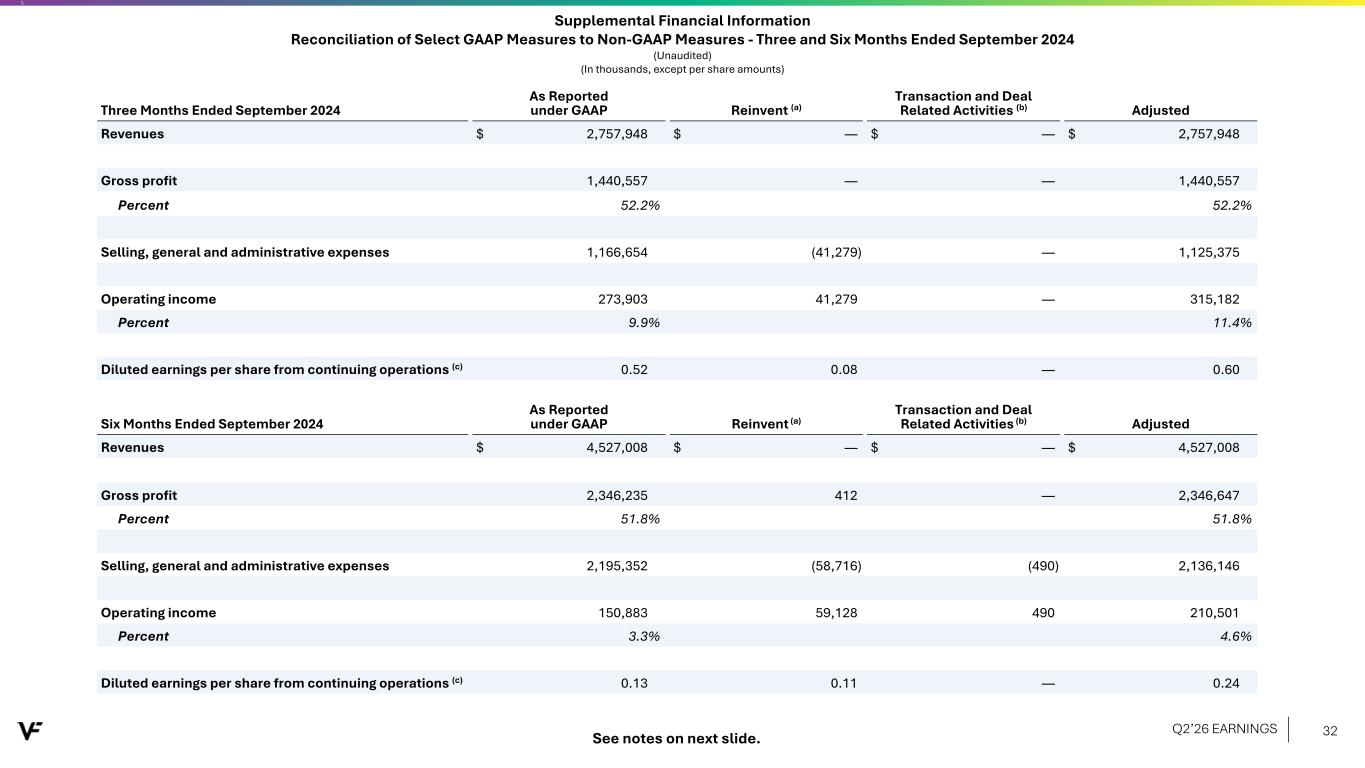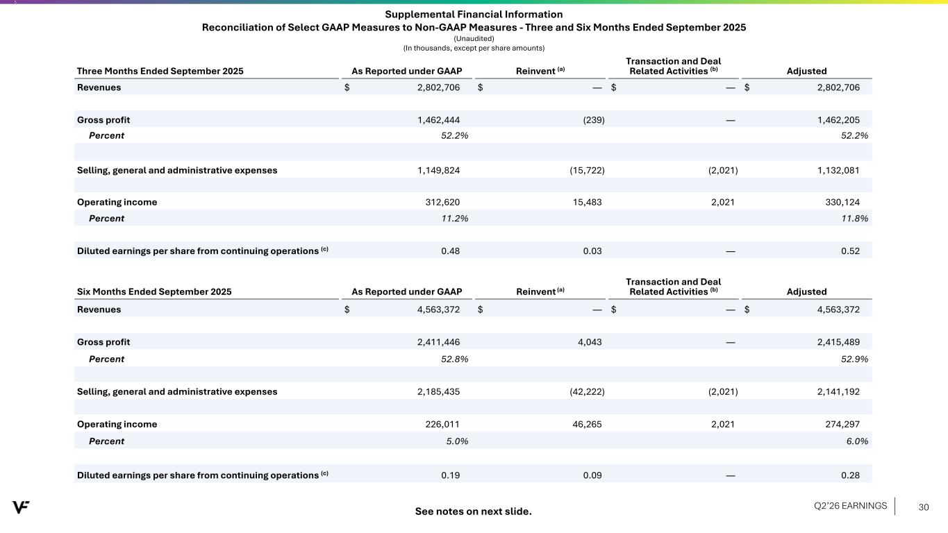补充财务信息选定GAAP措施与非GAAP措施的对账-截至2025年9月的三个月和六个月(未经审计)(以千为单位,每股金额除外)注:(a)与VF转型计划Reinvent相关的成本,包括重组费用和项目相关成本,在截至2025年9月的三个月和六个月中分别为1550万美元和4630万美元。这些成本主要涉及与聘用咨询公司支持VF转型之旅相关的遣散费和与员工相关的福利和费用。VF在2025财年第二季度与一家咨询公司签订了合同,合同下的服务预计将在2026财年第三季度基本完成。除了支付服务费用外,该合同还包括与截至2027年6月VF股价上涨相关的或有费用。截至2025年9月的三个月和六个月,与合同相关的费用,包括或有费用,分别为920万美元和1720万美元。Reinvent在截至2025年9月的三个月和六个月中分别产生了350万美元和1030万美元的净税收优惠。该公司与Reinvent相关的重组费用总额为2.117亿美元。基本上所有重组行动都在2026财年第一季度末完成。与这家咨询公司的合同相关的总费用可能高达1.460亿美元,其中7500万美元的费用取决于截至2027年6月VF股价的上涨。(b)交易和交易相关活动反映了与即将剥离Dickies相关的活动,截至2025年9月的三个月和六个月总计200万美元。交易和交易相关活动在截至2025年9月的三个月和六个月中产生了0.5百万美元的净税收优惠。(c)表中所列数额是使用未四舍五入的数字计算的。稀释每股收益影响分别使用截至2025年9月的三个月和六个月的393,986,000股和393,043,000股加权平均普通股计算。非GAAP财务信息上述财务信息是在GAAP基础上和调整后的基础上呈现的,其中不包括Reinvent和交易及交易相关活动的影响。调整后的列报方式提供了非公认会计原则的衡量标准。管理层认为,这些措施为投资者提供了有关VF基本业务趋势和VF持续运营业绩的有用补充信息,有助于对此类运营进行期间对比。管理层在其预算编制和审查过程中内部使用上述财务措施,在某些情况下,将其作为确定薪酬的一个因素。虽然管理层认为这些非GAAP财务指标对评估业务很有用,但这些信息应被视为补充性质,应被视为是对VF根据GAAP计算的经营业绩指标的补充,而不是代替或优于这些指标。此外,这些非GAAP财务指标可能与其他公司提出的类似标题的指标不同。26年第2季度收益31