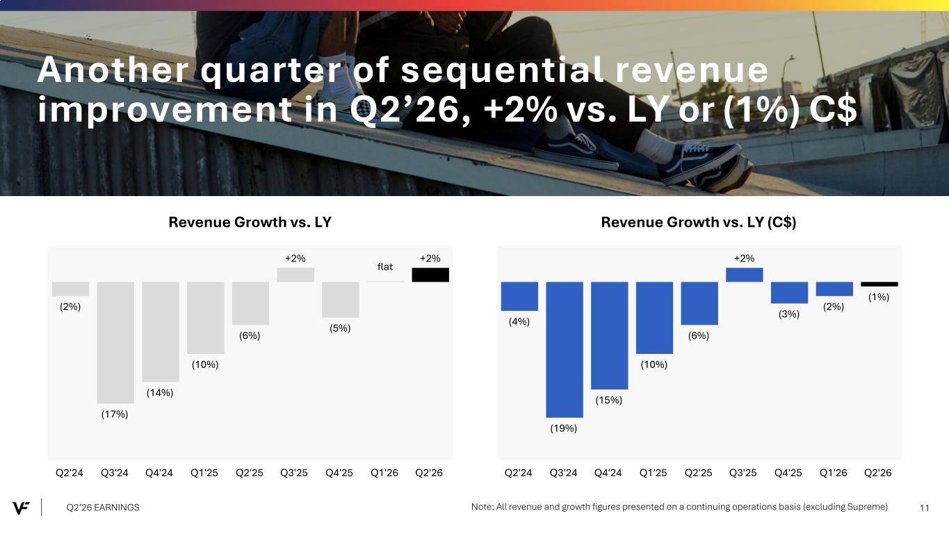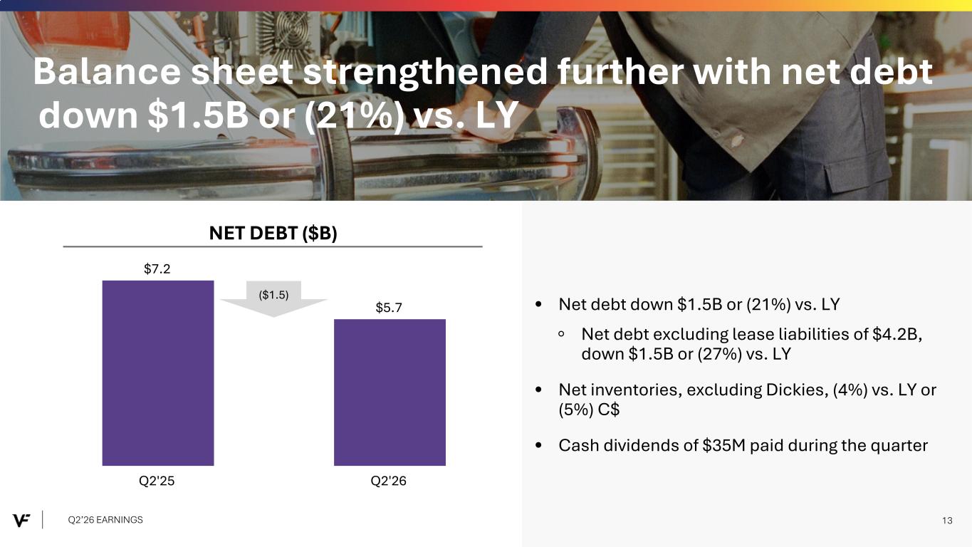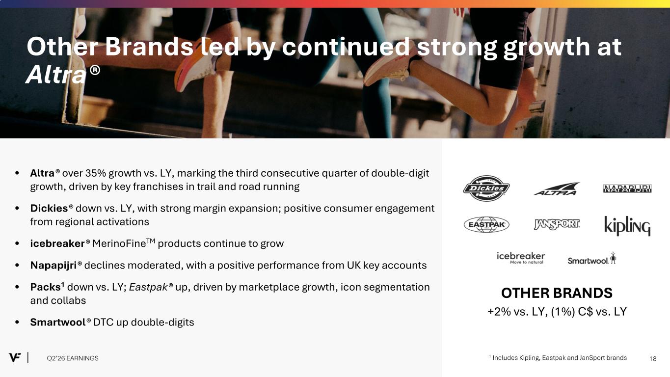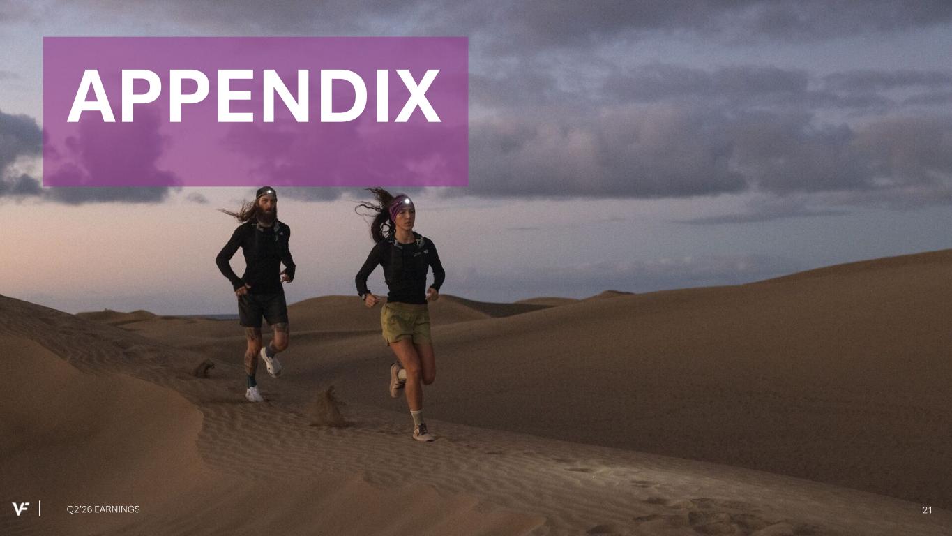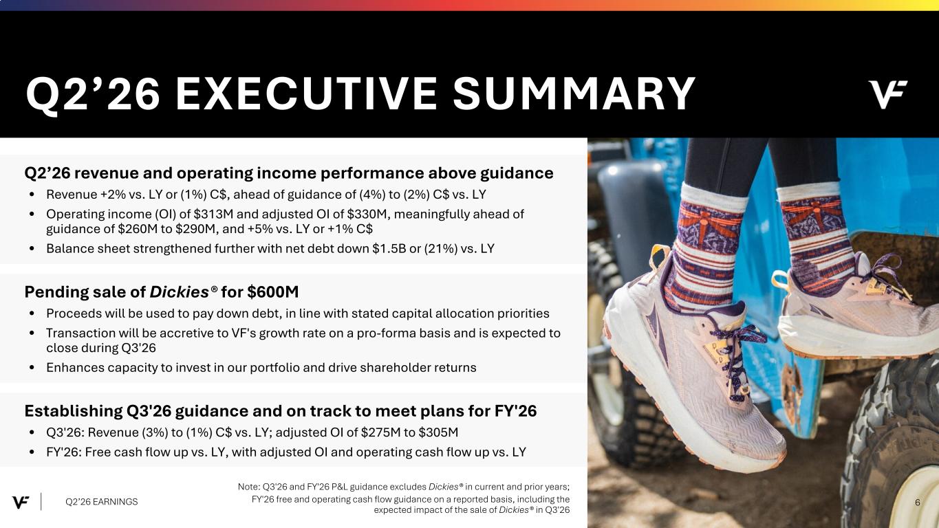财务列报披露所有每股金额均在稀释基础上列报。本演示文稿提及“报告”(R $)和“固定美元”(C $)或“固定货币”金额,这些术语在下面的标题“固定货币-不包括外币的影响”下描述。除非另有说明,“报告”和“不变美元”或“不变货币”的金额相同,除非另有说明,金额将作为“报告”。该演示文稿还提到了“持续”和“终止”运营金额,这是在“终止运营-Supreme”标题下描述的概念。除非另有说明,列报的结果均以持续经营为基础。这一表述还提到了“调整后”的金额,这一术语在“调整后的金额-不包括重塑和交易及交易相关活动”标题下进行了描述。除非另有说明,“报告”和“调整后”的金额是相同的。VF使用在最接近每年3月31日的星期六结束的52/53周会计年度进行运营和报告。本演示文稿将VF的2026财年第二季度称为Q2‘26,同样Q2’25表示VF的2025财年第二季度等。VF将“自由现金流”定义为来自持续经营业务的现金流减去资本支出和软件购买,并将“净债务”定义为长期债务、长期债务的流动部分、短期借款和经营租赁负债,减去VF合并资产负债表中的现金和现金等价物。可报告分部的变化VF在2026财年第一季度重新调整了其可报告分部。VF更新的可报告分部为Outdoor和Active。我们为未达到量化阈值的剩余经营分部列入了“所有其他”类别,作为单独的可报告分部进行披露。本演示文稿中VF的Q2‘26和Q2’25财务业绩反映了新的分部。Dickies持有待售2025年9月15日,VF与Bluestar Alliance LLC订立最终协议,出售Dickies®品牌业务(“Dickies”)。公司确定关联资产和负债符合持有待售会计准则,并在2025年9月合并资产负债表中进行了相应分类。终止运营-Supreme于2024年7月16日,VF与EssilorLuxottica S.A.签订了最终的股票和资产购买协议,以出售Supreme®品牌业务(“Supreme”)。2024年10月1日,VF完成了Supreme的销售。据此,公司已将相关的持有待售资产和负债报告为已终止经营业务的资产和负债,并将截至出售日期的所有期间的经营成果和业务现金流量计入已终止经营业务。不变货币-不包括外币的影响本列报是指根据美国公认会计原则(“GAAP”)“报告”的金额,其中包括外币汇率的换算和交易影响。该演示文稿还提到了“不变美元”和“不变货币”金额,其中不包括将外币换算成美元的影响。GAAP计量与固定货币金额的对账在本演示文稿中包含的补充财务信息中列出,该信息确定并量化了所有被排除的项目,并提供了管理层对这些信息为何对投资者有用的看法。调整后的金额-不包括Reinvent以及与交易和交易相关的活动本演示文稿中的调整后金额不包括与VF的转型计划Reinvent相关的成本。包括重组费用和项目相关成本在内的成本在2026财年第二季度约为1500万美元,在2026财年前六个月约为4600万美元。本演示文稿中的调整金额不包括与Dickies的未决剥离相关的交易和交易相关活动。交易和交易相关活动总额包括2026财年第二季度和前六个月约200万美元的成本。综合起来,上述项目对2026财年第二季度的每股亏损产生了0.04美元的负面影响,对2026财年前六个月的每股亏损产生了0.09美元的负面影响。此处引用的所有调整金额均不包括这些金额的影响。根据公认会计原则计算的措施与调整后金额的对账在本演示文稿包含的补充财务信息中列报,该信息确定并量化了所有排除的项目, 并提供了管理层关于这些信息为何对投资者有用的观点。该公司没有提供前瞻性措施的对账,如果该公司认为这种对账将意味着一定程度的精确度和确定性,这可能会使投资者感到困惑,并且无法在没有不合理努力的情况下合理预测GAAP措施中包含的某些项目。这是由于对尚未发生、不受公司控制或无法合理预测的各类项目的时间或金额进行预测具有内在的难度。出于同样的原因,该公司无法解决无法获得的信息的可能意义。Q2’26收益2